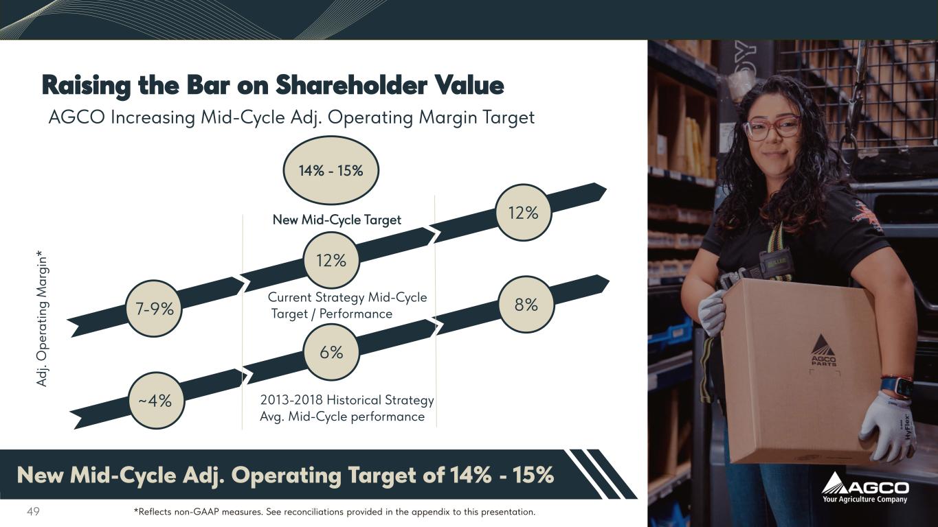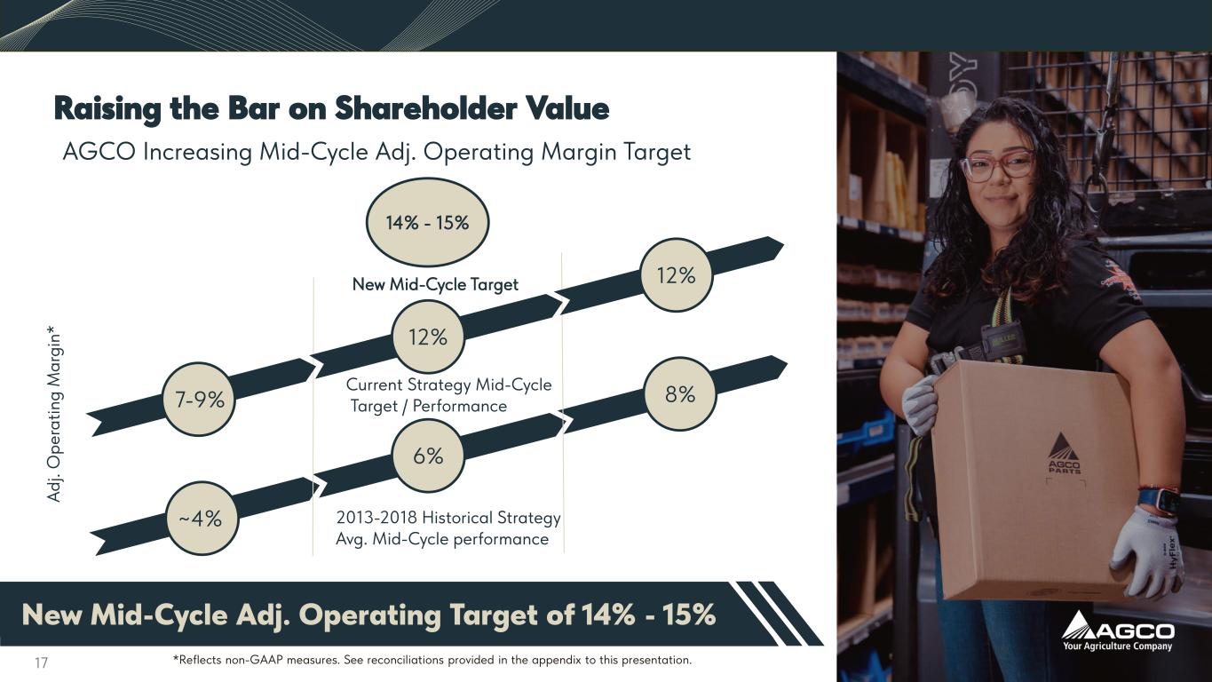 执行我们的农民第一战略| INVESTOR DAY提高股东价值的标准AGCO增加中周期调整。营业利润率目标A DJ。O PE ra tin g m ar gi n*新中周期Adj.经营目标14%-15 % 2013-2018年历史策略平均中周期业绩当前策略中周期标的/业绩新中周期标的14%-15% 12% 8% 6% 12% 7-9 %~4% 17*反映非公认会计原则措施。见本演示文稿附录中提供的对账。