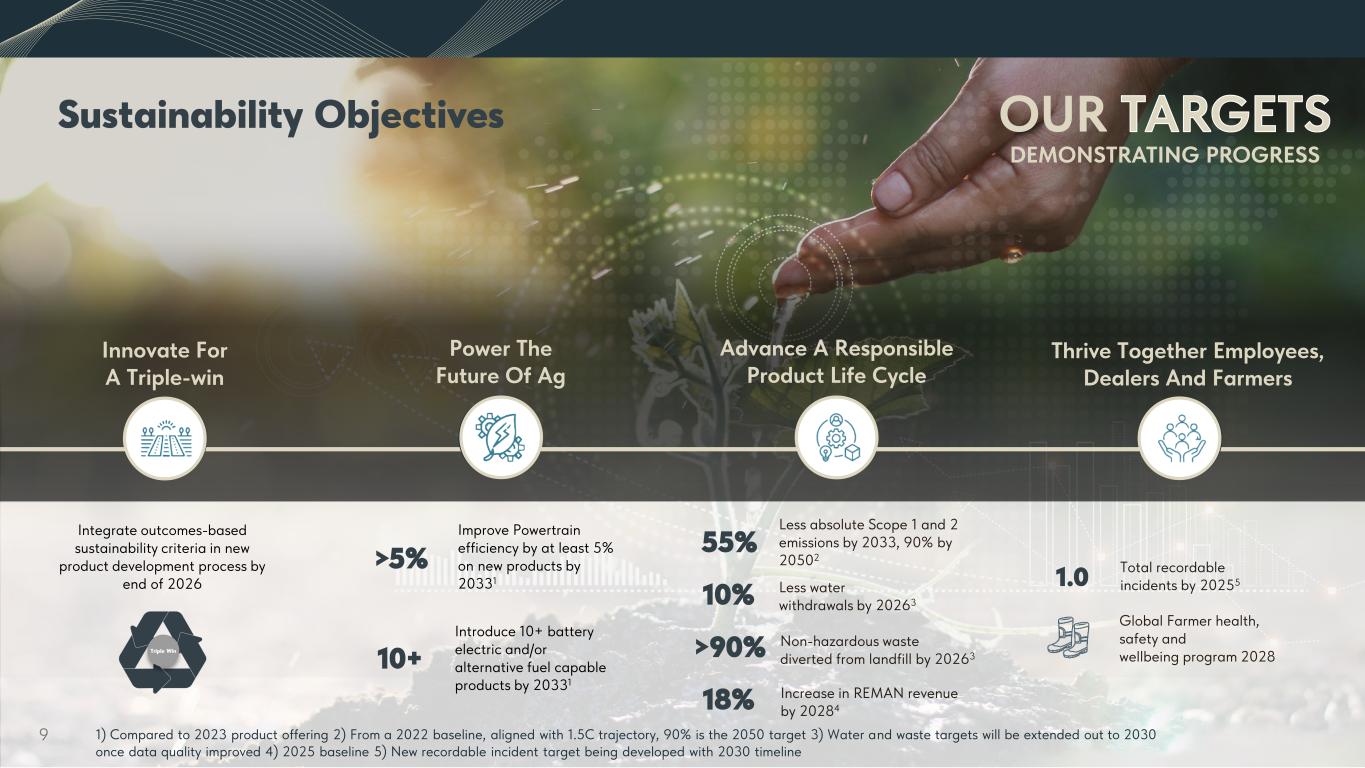 我们的目标展示了进展1)与2023年产品供应相比2)从2022年基线来看,与1.5C轨迹保持一致,90%是2050年目标3)一旦数据质量改善,水和废物目标将延长至2030年4)2025年基线5)正在制定新的可记录事件目标与2030年时间线可持续性目标为三赢力量进行创新AG推进的未来一个负责任的产品生命周期将共同繁荣员工、经销商和农民到202551.0全球农民健康,2028年安全和福利计划到2026年底在新产品开发过程中整合基于结果的可持续性标准三赢在20331年之前在新产品上至少提高5%的动力总成效率到20331年引入10 +电池电动和/或替代燃料能力产品到20331年> 5% 10 +到2033年减少绝对范围1和2排放,到20502年减少90% 55%减少取水量到2026310%到20263年从垃圾填埋场转移的非危险废物>到2028418% REMAN收入增加90% 9