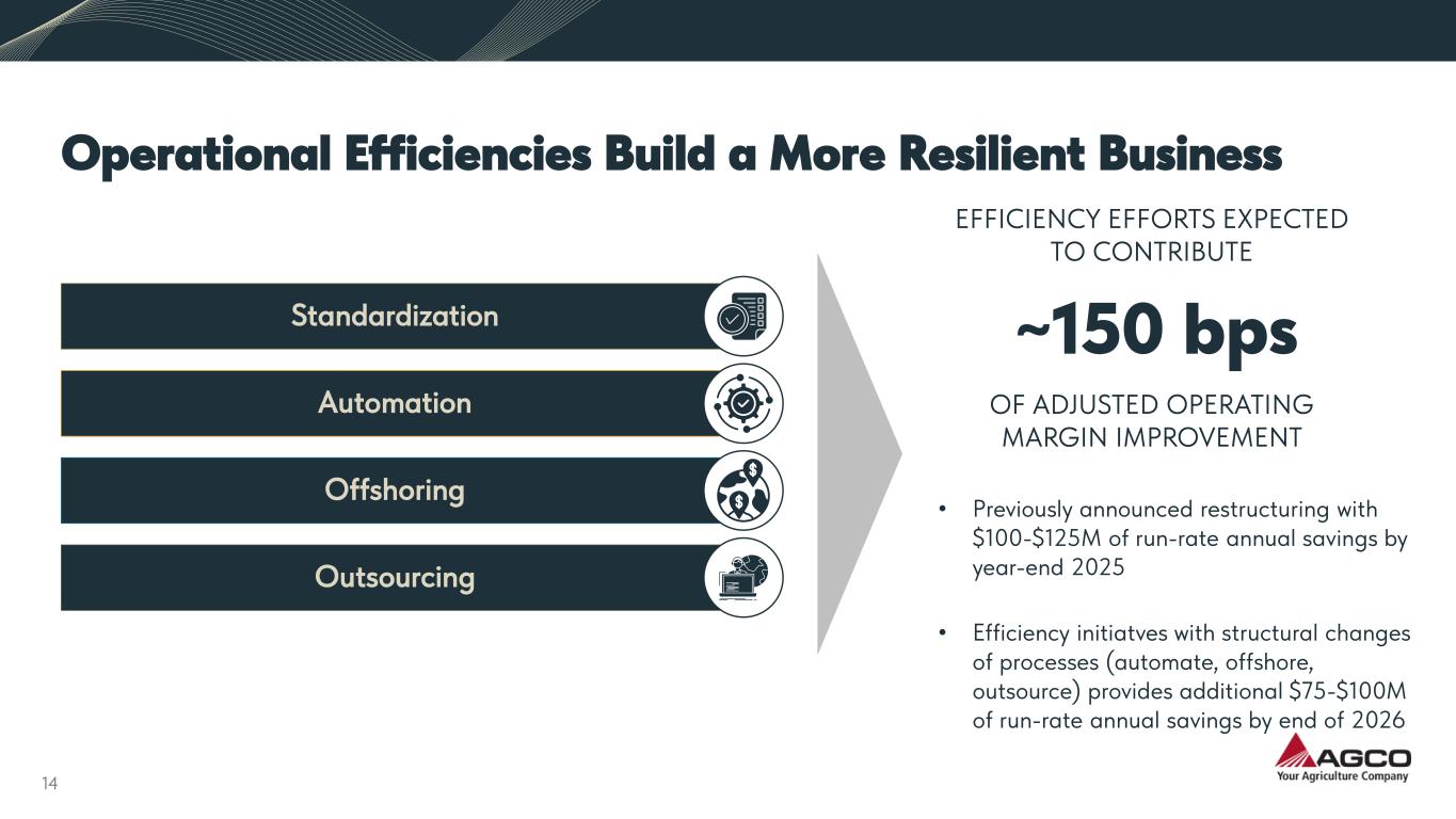 加速全球零部件增长展望未来,AGCO零部件专注于三大战略支柱:(1)在正确的地点正确的零部件,每一次都有行业领先的加满率(2)客户忠诚度和高重购(3)数字化支持的解决方案20232029E 130575 + > 300%净销售额(十亿美元)电子商务(百万美元)2024E 2029E 1.8 2.3~+ 30% 25%通过电子商务的零部件销售额净销售额增长至23亿美元13