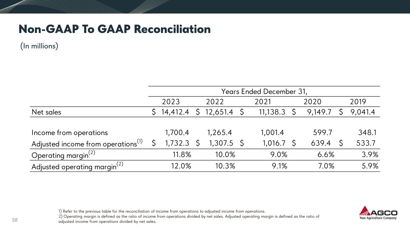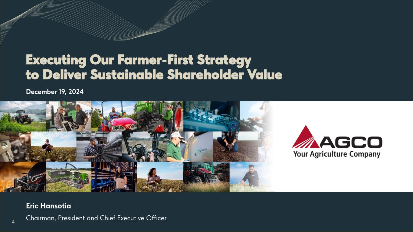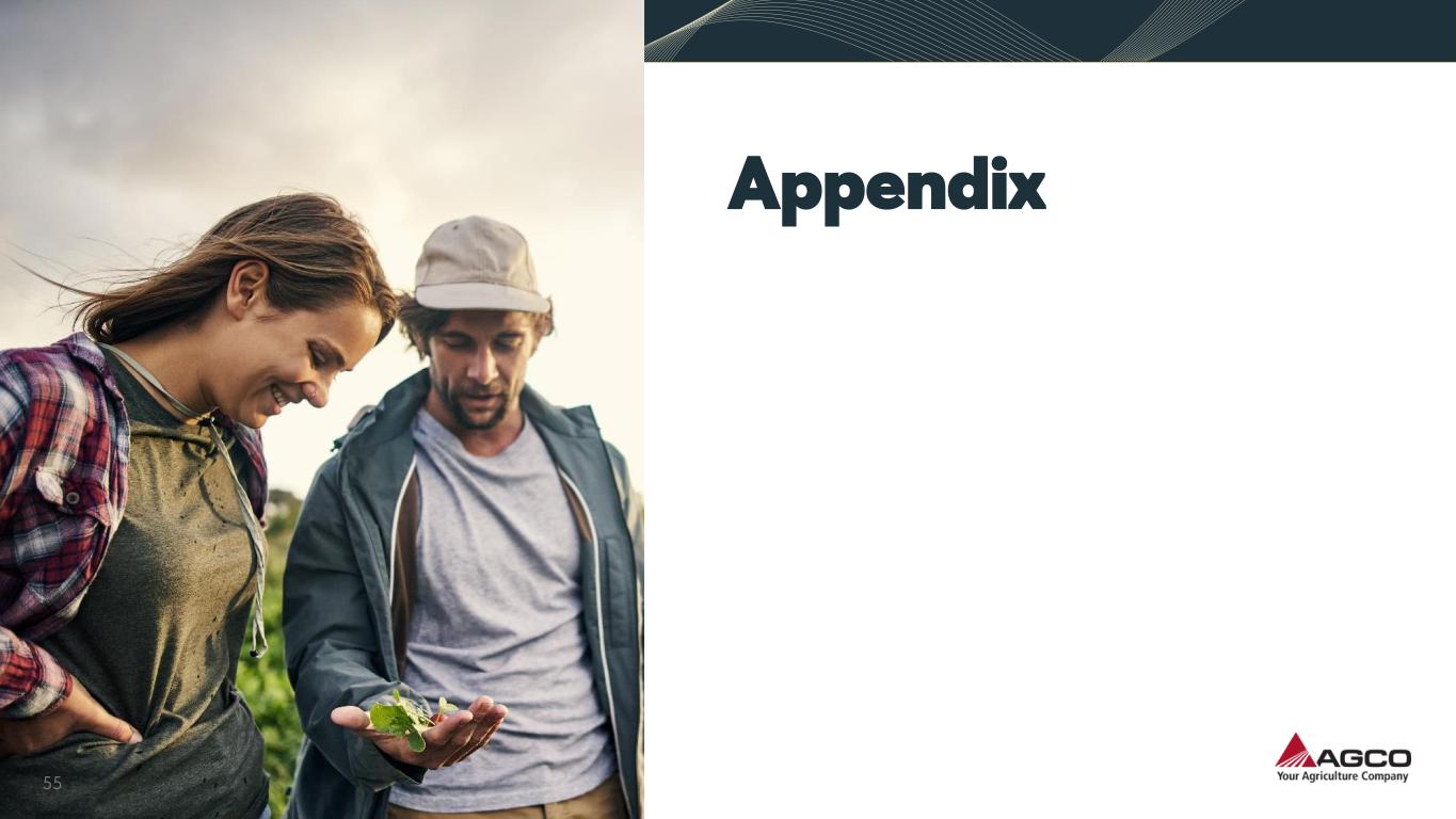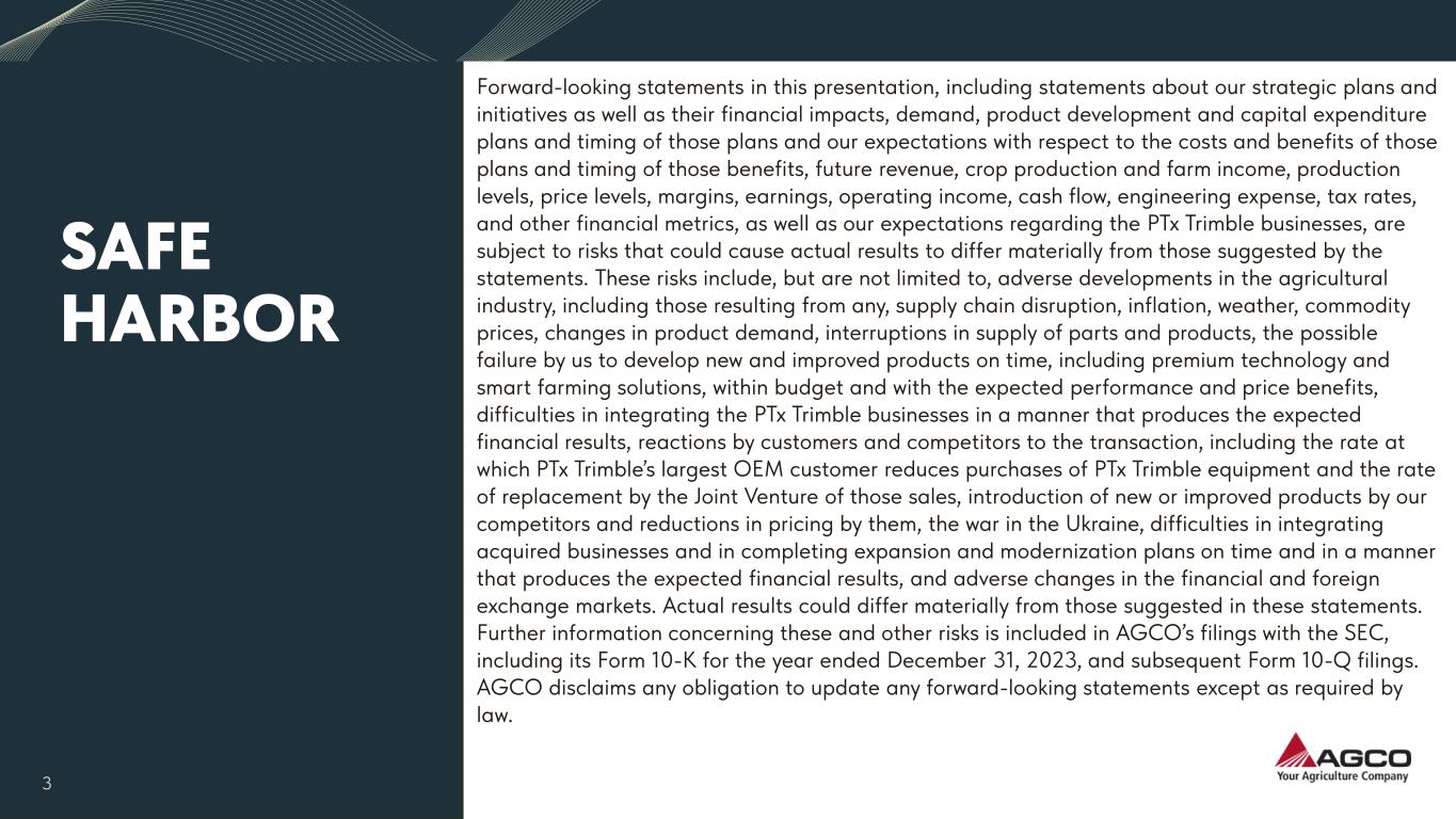 本演示文稿中的前瞻性陈述,包括关于我们的战略计划和举措及其财务影响、需求、产品开发和资本支出计划以及这些计划的时间安排的陈述,以及我们对这些计划的成本和收益以及这些收益的时间安排的预期、未来收入、作物生产和农场收入、生产水平、价格水平、利润率、收益、营业收入、现金流、工程费用、税率和其他财务指标的预期,以及我们对PTX 天宝导航业务的预期,受制于可能导致实际结果与声明所暗示的结果大不相同的风险。这些风险包括但不限于农业行业的不利发展,包括任何由此导致的风险、供应链中断、通货膨胀、天气、商品价格、产品需求的变化、零部件和产品供应的中断、我们可能未能在预算范围内并以预期的性能和价格效益按时开发新的和改进的产品,包括优质技术和智能农业解决方案、难以以产生预期财务结果的方式整合PTX 天宝导航业务、客户和竞争对手对交易的反应,包括PTX 天宝导航的最大OEM客户减少购买PTX 天宝导航设备的速度以及合资企业对这些销售的更换率、我们的竞争对手引入新的或改进的产品并由他们降低价格、乌克兰战争、整合收购的业务以及按时以产生预期财务结果的方式完成扩张和现代化计划方面的困难,以及金融和外汇市场的不利变化。实际结果可能与这些声明中提出的结果大不相同。有关这些风险和其他风险的更多信息包含在AGCO提交给SEC的文件中,包括其截至2023年12月31日止年度的10-K表格,以及随后提交的10-Q表格文件。除法律要求外,AGCO不承担更新任何前瞻性陈述的义务。安全港3