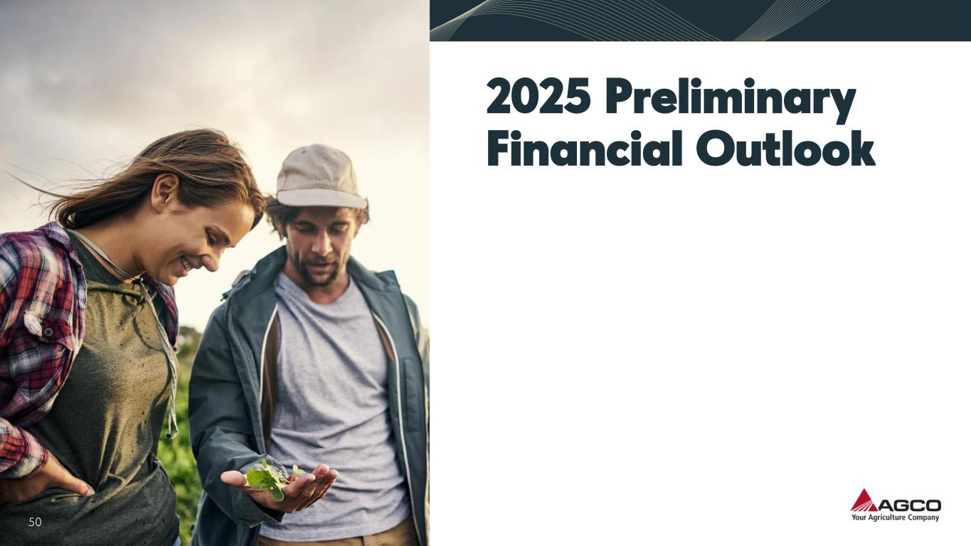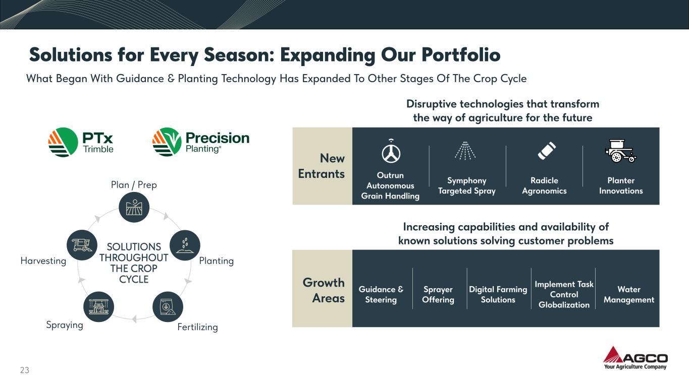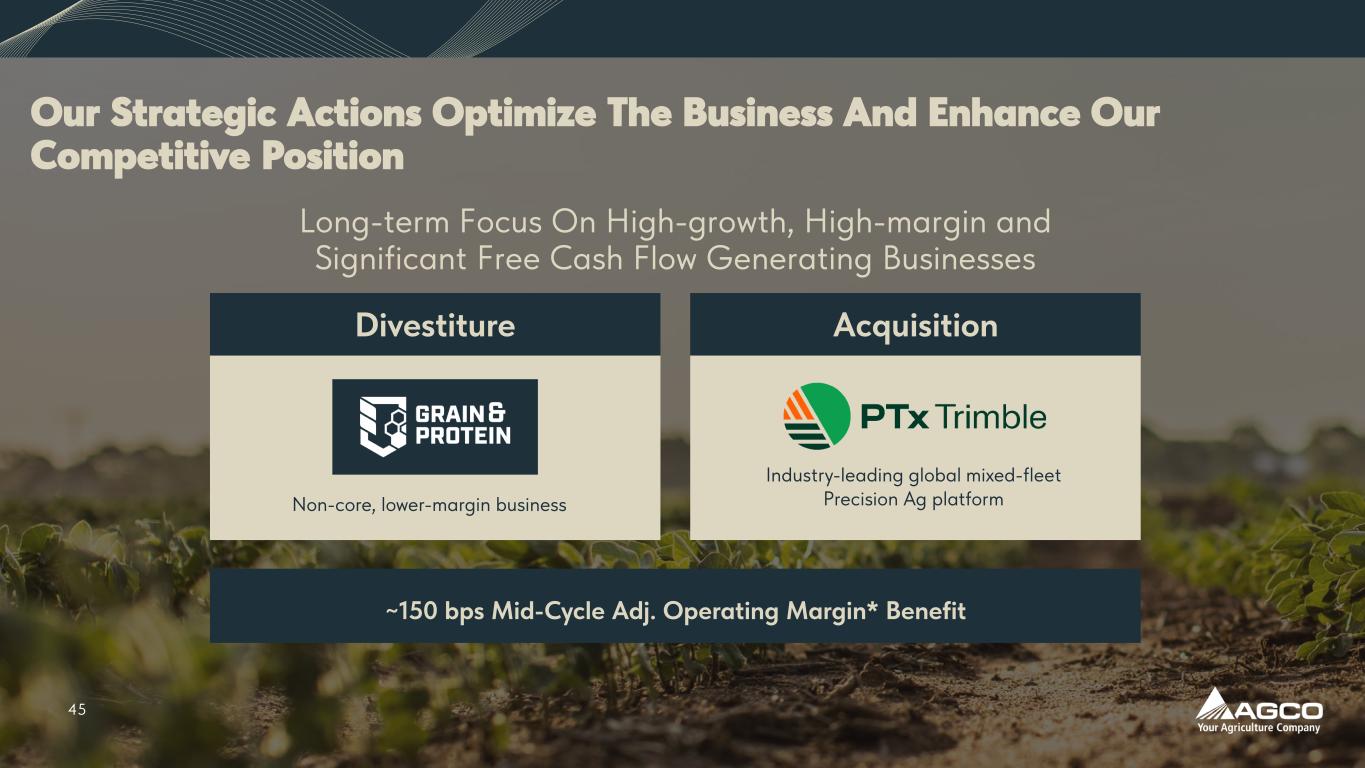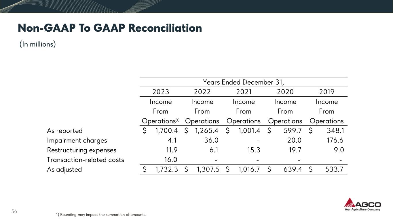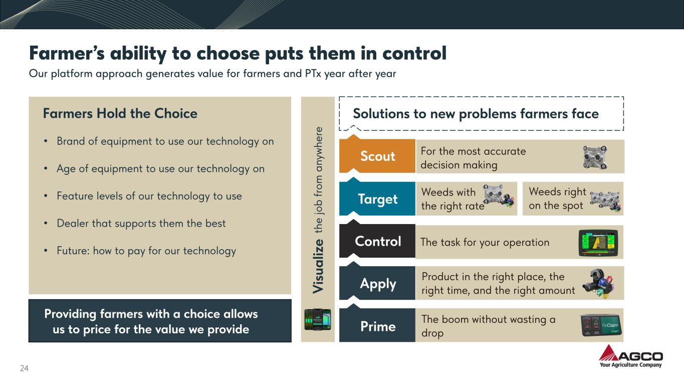 本演示文稿中的前瞻性陈述,包括关于我们的战略计划和举措及其财务影响、需求、产品开发和资本支出计划以及这些计划的时间安排的陈述,以及我们对这些计划的成本和收益以及这些收益的时间安排的预期、未来收入、作物生产和农场收入、生产水平、价格水平、利润率、收益、营业收入、现金流、工程费用、税率和其他财务指标的预期,以及我们对PTX 天宝导航业务的预期,受制于可能导致实际结果与声明所暗示的结果大不相同的风险。这些风险包括但不限于农业行业的不利发展,包括任何由此导致的风险、供应链中断、通货膨胀、天气、商品价格、产品需求的变化、零部件和产品供应的中断、我们可能未能在预算范围内并以预期的性能和价格效益按时开发新的和改进的产品,包括优质技术和智能农业解决方案、难以以产生预期财务结果的方式整合PTX 天宝导航业务、客户和竞争对手对交易的反应,包括PTX 天宝导航的最大OEM客户减少购买PTX 天宝导航设备的速度以及合资企业对这些销售的更换率、我们的竞争对手引入新的或改进的产品并由他们降低价格、乌克兰战争、整合收购的业务以及按时以产生预期财务结果的方式完成扩张和现代化计划方面的困难,以及金融和外汇市场的不利变化。实际结果可能与这些声明中提出的结果大不相同。有关这些风险和其他风险的更多信息包含在AGCO提交给SEC的文件中,包括其截至2023年12月31日止年度的10-K表格,以及随后提交的10-Q表格文件。除法律要求外,AGCO不承担更新任何前瞻性陈述的义务。安全港3