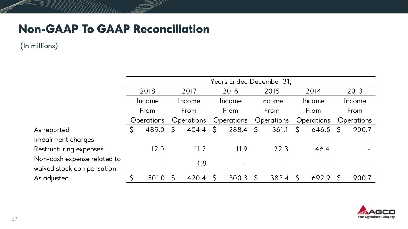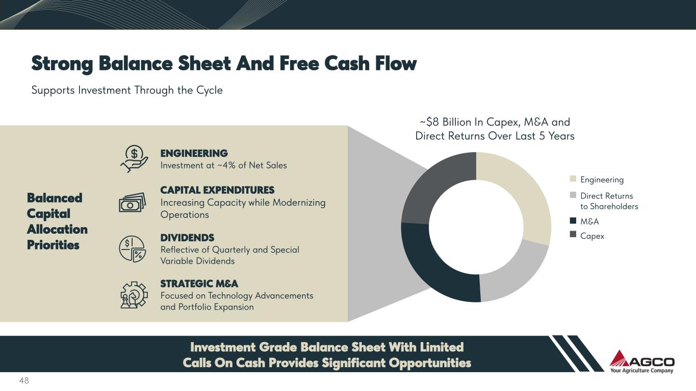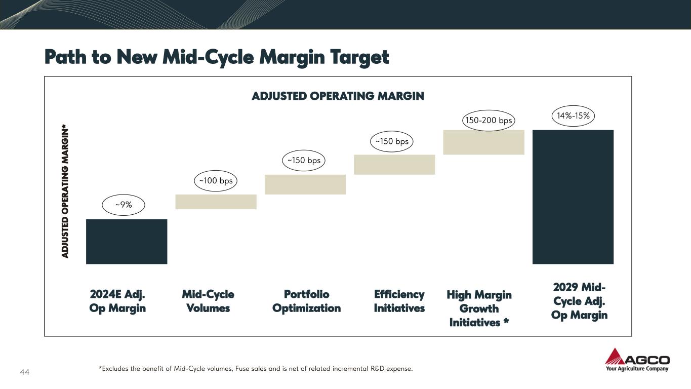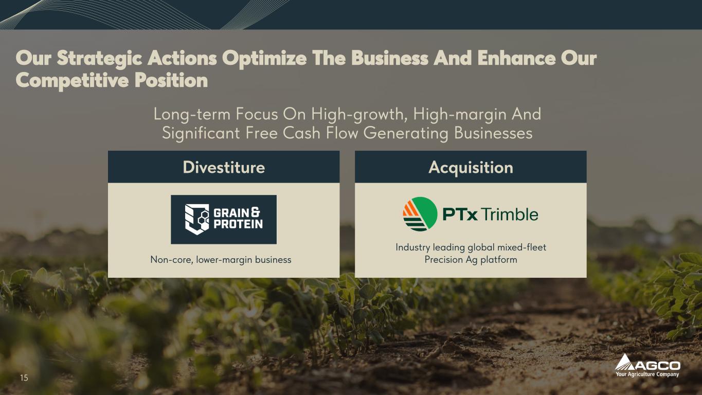 本演示文稿中的前瞻性陈述,包括关于我们的战略计划和举措及其财务影响、需求、产品开发和资本支出计划以及这些计划的时间安排的陈述,以及我们对这些计划的成本和收益以及这些收益的时间安排的预期、未来收入、作物生产和农场收入、生产水平、价格水平、利润率、收益、营业收入、现金流、工程费用、税率和其他财务指标的预期,以及我们对PTX 天宝导航业务的预期,受制于可能导致实际结果与声明所暗示的结果大不相同的风险。这些风险包括但不限于农业行业的不利发展,包括任何由此导致的风险、供应链中断、通货膨胀、天气、商品价格、产品需求的变化、零部件和产品供应的中断、我们可能未能在预算范围内并以预期的性能和价格效益按时开发新的和改进的产品,包括优质技术和智能农业解决方案、难以以产生预期财务结果的方式整合PTX 天宝导航业务、客户和竞争对手对交易的反应,包括PTX 天宝导航的最大OEM客户减少购买PTX 天宝导航设备的速度以及合资企业对这些销售的更换率、我们的竞争对手引入新的或改进的产品并由他们降低价格、乌克兰战争、整合收购的业务以及按时以产生预期财务结果的方式完成扩张和现代化计划方面的困难,以及金融和外汇市场的不利变化。实际结果可能与这些声明中提出的结果大不相同。有关这些风险和其他风险的更多信息包含在AGCO提交给SEC的文件中,包括其截至2023年12月31日止年度的10-K表格,以及随后提交的10-Q表格文件。除法律要求外,AGCO不承担更新任何前瞻性陈述的义务。安全港3