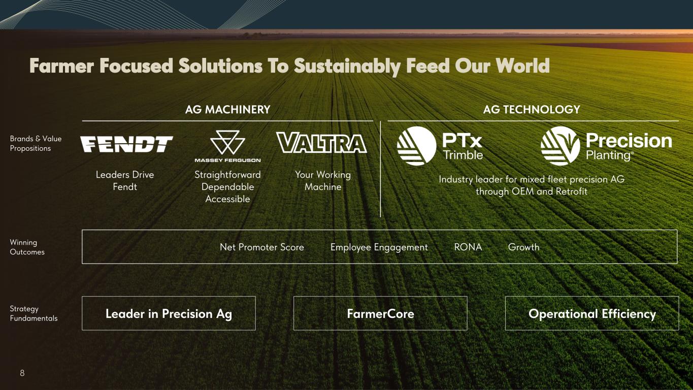 支撑长期趋势&有弹性的终端市场1)来源标普全球商品洞察人口增长蛋白质消费耕种面积增加对生物燃料的需求潜移默化的趋势投入成本上升,对可持续性的关注程度提高,AGCO有能力应对潜移默化的趋势并更好地服务于农民世界作物使用将推动精准农业和机械增长(1)0.0B 0.5B 1.0B 1.5B 2.0B 2.5B 3.0B 3.5B 4.0B Bi lli on s of M et ric t on s作物年度世界玉米+大豆+小麦使用7