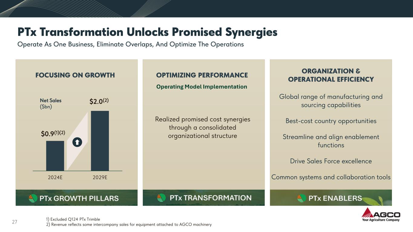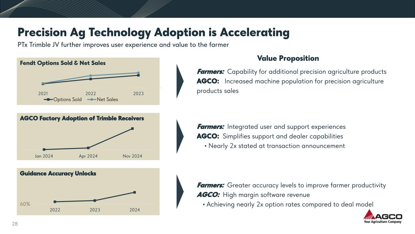 PTX转型解锁承诺的协同效应将作为一项业务运营,消除重叠,并优化运营,重点是增长优化绩效组织和运营效率2024E 2029E $ 2.0(2)$ 0.9(1)(2)运营模式实施通过整合的组织结构实现承诺的成本协同效应全球范围的制造和采购能力成本最高的国家机会精简和调整使能功能推动销售队伍的卓越共同系统和协作工具27净销售额(十亿美元)1)不包括Q124 PTX 天宝导航 2)收入反映了附加在AGCO机械设备上的一些公司间销售