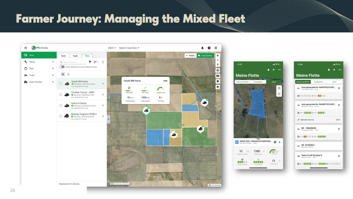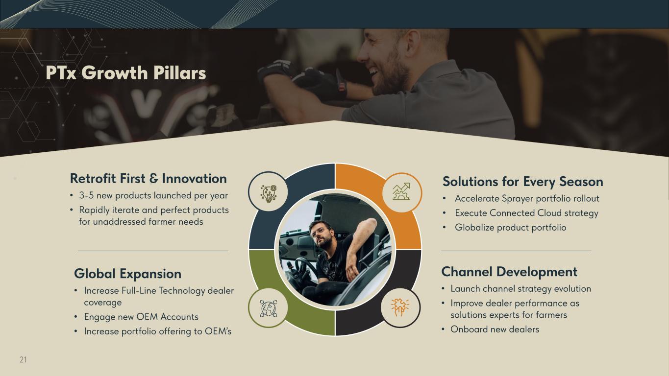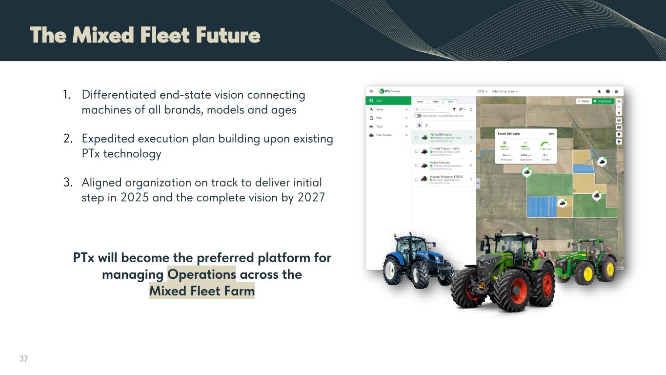 混合舰队未来1。所有品牌、型号和年龄的差异化终端状态视觉连接机器2。基于现有PTX技术的加速执行计划3。步调一致的组织有望在2025年交付第一步,到2027年实现完整愿景PTX将成为管理整个混合车队农场运营的首选平台37