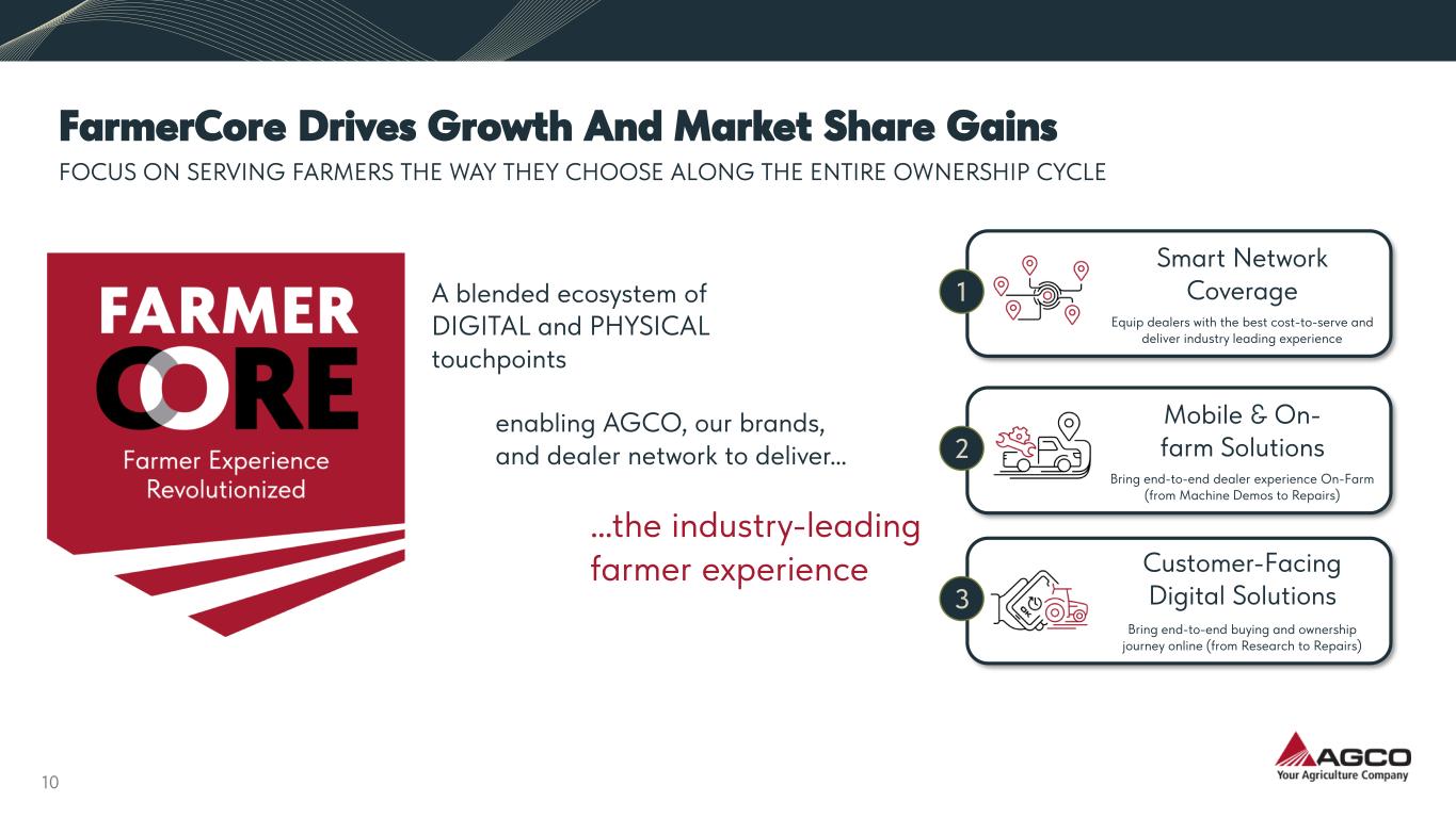 FarmerCore推动增长并获得市场份额一个数字和物理接触点的混合生态系统,使AGCO、我们的品牌和经销商网络能够交付……行业领先的农民体验专注于以他们沿着整个所有权周期选择的方式为农民提供服务智能网络覆盖为经销商提供最佳的服务成本,并提供行业领先的体验1移动和农场解决方案带来端到端的农场经销商体验(从机器演示到维修)2面向客户的数字解决方案将端到端的购买和拥有之旅带到线上(从研究到维修)310