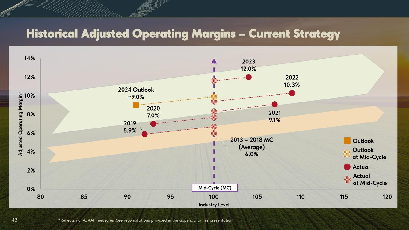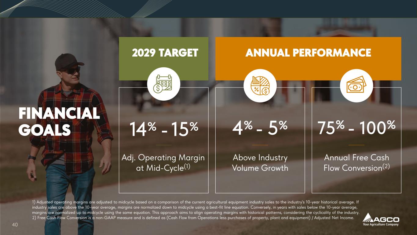 财务目标14%-15%调整后营业利润率处于中周期(1)2029年目标高于行业销量增长4%-5% 75%-100%年度自由现金流转换(2)年度业绩401)调整后的营业利润率基于当前农业设备行业销售额与行业10年历史平均水平的比较调整至中周期。如果行业销售额高于10年平均水平,则使用最佳拟合线方程将利润率正常化到周期中期。相反,在销售额低于10年平均水平的年份,使用相同的等式将利润率正常化到周期中期。考虑到行业的周期性,这种方法旨在使营业利润率与历史模式保持一致。2)自由现金流转换是一种非GAAP衡量标准,定义为(运营现金流减购买物业、厂房和设备)/调整后净收入。