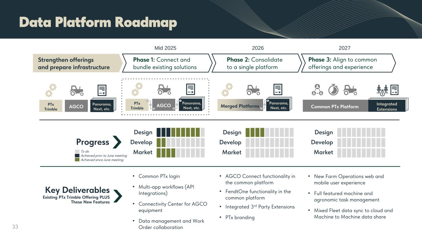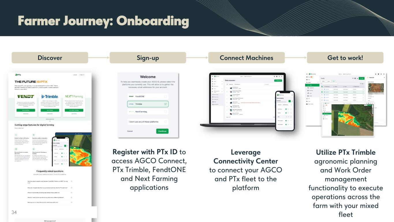 Next,Panor ama Next,Panorama Next,Panor ama Next,Panorama PTX 天宝导航AGCO Panorama,Next等。Next,Panor ama Next,Panorama Mid 2025 Key Deliverables Existing PTX 天宝导航 offering PLUS these new feature progress • common PTX login • multi-app workflows(API integrations)• AGCO设备的连接中心•数据管理和工单协作•共有平台中的AGCO Connect功能•共有平台中的FendtOne功能•集成的3rd party extensions • PTX branding •新的农场运营网页和移动用户体验•全功能机器和农艺任务管理•混合车队数据同步到云端和机器对机器数据共享20262027 Next,Panorama Next,Panora a Design Develop Market Design Develop Market Design Market Design Develop Market Data Platform Roadmap Phase 1:Connect and Bundle Existing Solutions Phase 2:Consolidate to a Single Platform Phase 3:Align to Common Products and Experience Strengthen Products and Prepare Infrastructure PTX丨Trimble 丨AGCO Panorama,Next,etc。合并平台全景、Next等通用PTX平台集成扩展要做6月会议前已实现6月会议以来已实现33