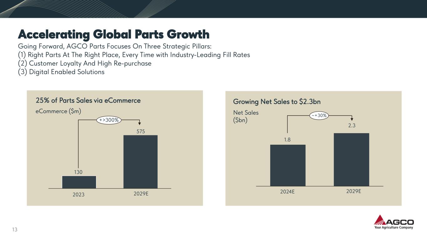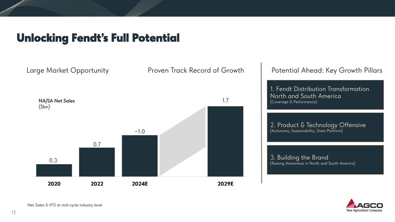解锁Fendt在中周期行业水平1的全部潜在净销售额& IFO。Fendt分销转型北美和南美(覆盖范围和性能)2。产品&技术攻势(自主性、可持续性、数据平台)3。打造品牌(提高北美和南美的知名度)潜力:关键增长支柱巨大的市场机会经验证的增长记录NA SA EMEAPA 0.3 0.7~1.0 1.7 20202022 2024E 2029E NA/SA净销售额(十亿美元)12