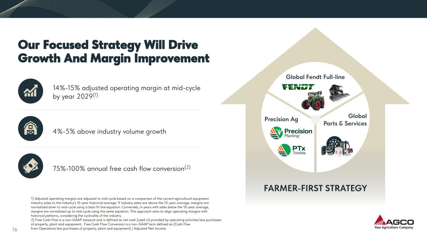 我们的重点战略将推动增长和利润率改善1)根据当前农业装备行业销售额与行业10年历史平均水平的比较,调整后的营业利润率调整至中周期。如果行业销售额高于10年平均水平,则使用最佳拟合线方程将利润率标准化到周期中期。相反,在销售额低于10年平均水平的年份,使用相同的等式将利润率正常化到周期中期。考虑到行业的周期性,这种方法旨在使营业利润率与历史模式保持一致。2)自由现金流是一种非公认会计准则衡量指标,定义为经营活动提供的净现金(用于)减去购买物业、厂房和设备。自由现金流转换是一个非GAAP术语,定义为(运营现金流减购买物业、厂房和设备)/调整后的净收入。FARMER-FIRST Strategy Global Fendt全线Precision AG Global Parts & Services 2029年中期调整后营业利润率14%-15 %(1)高于行业销量增长75%-100 %年自由现金流转换4%-5 %(2)16