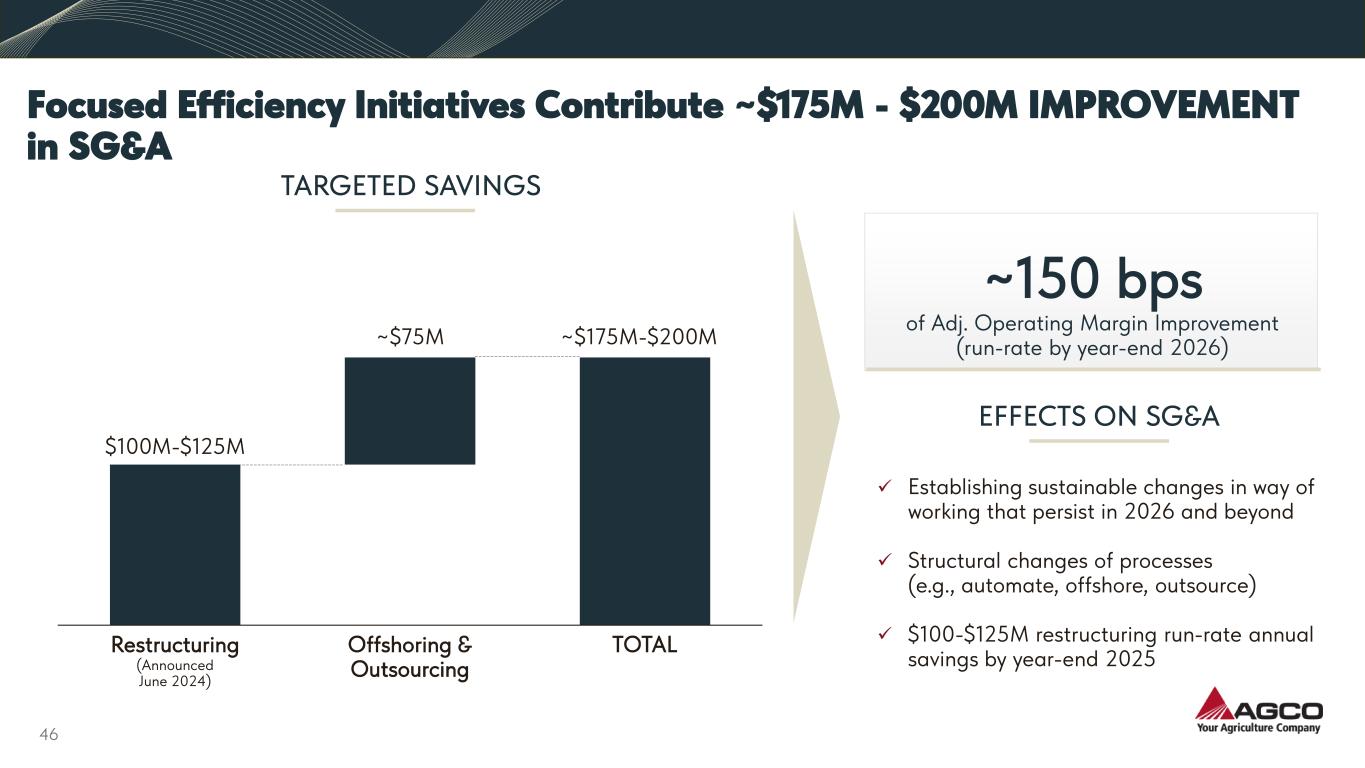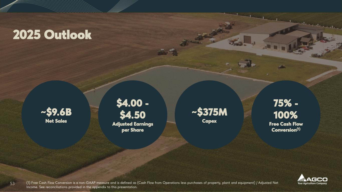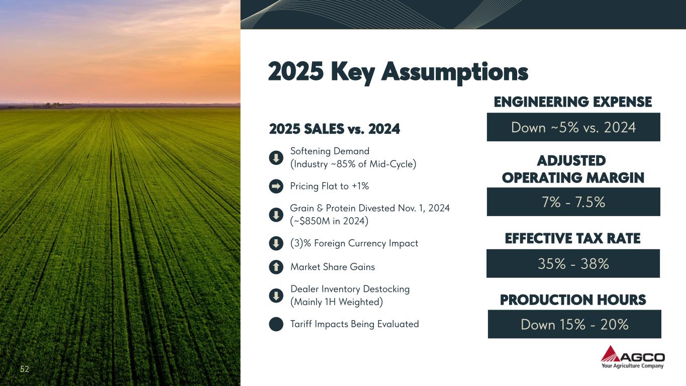 2025年关键假设工程费用下降~5%与2024年调整后营业利润率7%-7.5%有效税率35%-38% 2025年销售与2024(3)%外币影响定价持平至+ 1%市场份额收益谷物和蛋白质剥离2024年11月1日(2024年约为8.5亿美元)经销商库存去库存(主要是1H加权)关税影响正在评估需求疲软(行业约85%的中周期)生产小时数下降15%-20% 52