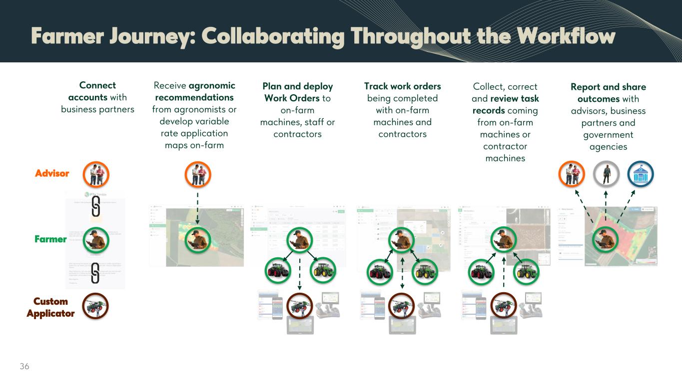 与业务合作伙伴连接账户Advisor Farmer Custom Applicator接收农艺师的农艺建议或开发农场计划中的可变费率应用地图并将工作订单部署到农场机器上,工作人员或承包商跟踪使用农场机器完成的工作订单,承包商收集、更正和审查来自农场机器或承包商机器的任务记录报告并与顾问、业务合作伙伴和政府机构分享结果Farmer Journey:在整个工作流程中协作36