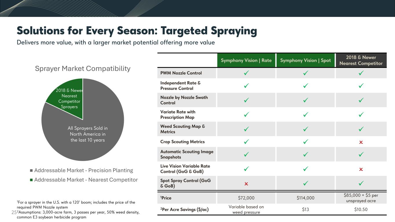 每一季的解决方案:有针对性的喷洒传递更多价值,更大的市场潜力提供更有价值的25 Symphony Vision | Rate Symphony Vision | Spot 2018 &较新的竞争对手PWM喷嘴控制丨丨丨独立速率和压力控制丨丨丨逐个喷嘴的喷嘴SwAWAT控制丨丨丨带处方图的可变速率丨丨丨杂草侦察图和指标的可变速率丨丨丨自动侦察图图像快照丨丨Live Vision可变速率控制(GoG & GoB)丨丨1价格$ 72,000 $ 114,000 $ 85,000 + $ 5 per未喷洒的英亩每英亩节省2美元($/ac)基于杂草压力的变量$ 13 $ 10.50 1美国喷雾器的120 ' boom;包括所需PWM喷嘴系统的价格2假设:3,000英亩农场,每年3次通过,杂草密度50%,常见的E3大豆除草剂计划喷雾器市场兼容性可寻址市场-精密种植可寻址市场-最近的竞争对手2018年和较新的竞争对手喷雾器过去10年在北美销售的所有喷雾器