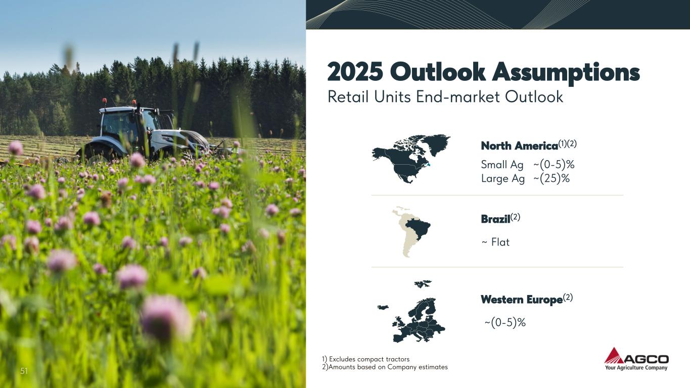 2025年展望假设零售单位终端市场展望北美(1)(2)小型AG~(0-5)%大型AG~(25)%西欧(2)~(0-5)%巴西(2)~平511)不包括紧凑型拖拉机2)金额基于公司估计