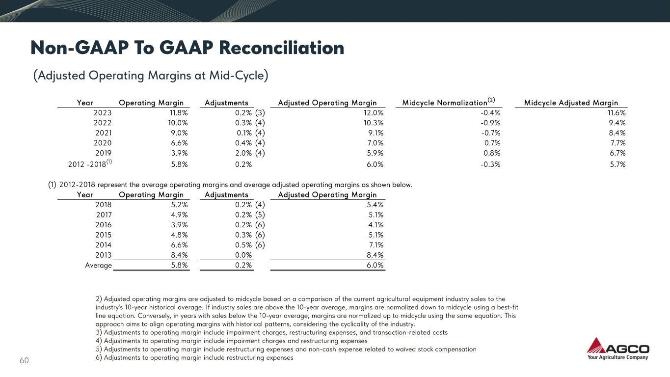 601)四舍五入可能会影响金额的总和(周期中期调整后的营业利润率)非公认会计原则与公认会计原则的调节2)调整后的营业利润率根据当前农业设备行业销售额与行业10年历史平均水平的比较调整为周期中期。如果行业销售额高于10年平均水平,则使用最佳拟合线方程将利润率正常化到周期中期。相反,在销售额低于10年平均水平的年份,使用相同的等式将利润率正常化到周期中期。考虑到行业的周期性,这种方法旨在使营业利润率与历史模式保持一致。3)营业利润率调整包括减值费用、重组费用、和交易相关成本4)营业利润率调整包括减值费用和重组费用5)营业利润率调整包括重组费用与豁免股票补偿相关的非现金费用6)营业利润率调整包括重组费用年份营业利润率调整后营业利润率中周期正常化(2)中周期调整后利润率202311.8% 0.2%(3)12.0%-0.4 % 11.6% 202210.0% 0.3%(4)10.3%-0.9 % 9.4% 20219.0% 0.1%(4)9.1%-0.7 % 8.4% 20206.6% 0.4%(4)7.0% 0.7% 7.7% 20193.9% 2.0%(4)5.9% 0.8% 6.7% 2012-2018(1)5.8% 0.2% 6.0%-0.3 % 5.7%(1)2012-2018代表平均营业利润率和平均调整后营业利润率如下所示。年份营业利润率调整后营业利润率2018年5.2% 0.2%(4)5.4% 2017年4.9% 0.2%(5)5.1% 2016年3.9% 0.2%(6)4.1% 2015年4.8% 0.3%(6)5.1% 2014年6.6% 0.5%(6)7.1% 2013年8.4% 0.0% 8.4%平均5.8% 0.2% 6.0%