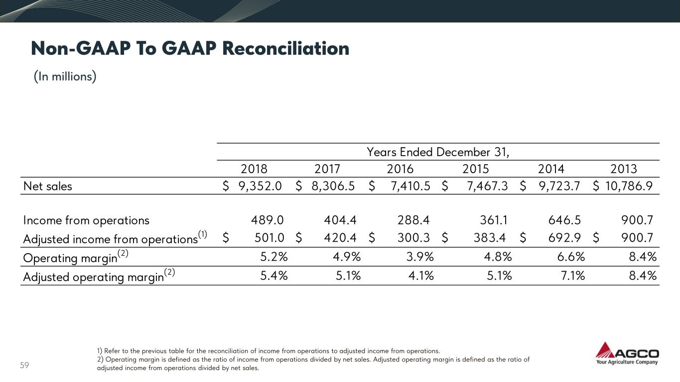 59(1)四舍五入可能会影响金额的总和(百万)非GAAP与GAAP调节1)运营收入与调整后运营收入的调节请参见上表。2)营业利润率定义为营业收入除以净销售额的比率。调整后营业利润率定义为调整后营业收入除以净销售额的比率。2018年2017年2016年2015年2014年2013年净销售额9,352.0美元8,306.5美元7,410.5美元7,467.3美元9,723.7美元10,786.9美元营业收入489.04 04.4288.4361.16 46.5900.7调整后营业收入(1)501.0美元420.4美元300.3美元383.4美元69 2.9美元900.7美元营业利润率(2)5.2% 4.9% 3.9% 4.8% 6.6% 8.4%调整后营业利润率(2)5.4% 5.1% 4.1% 5.1% 7.1% 8.4%截至12月31日止年度,