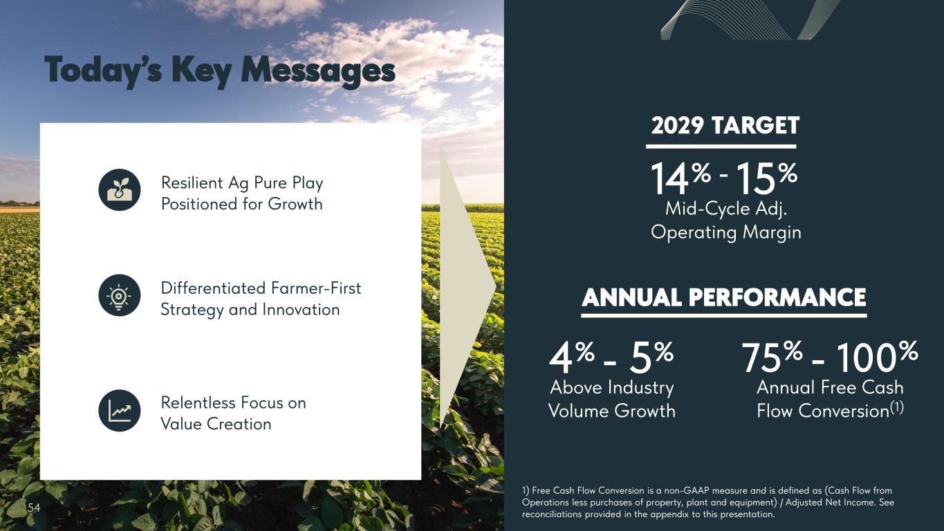 Resilient AG Pure Play定位于增长差异化的农民至上战略和创新不懈地专注于价值创造今日关键信息14%-15% 4%-5%高于行业销量增长75%-100%年度自由现金流转换(1)年度业绩541)自由现金流转换是非公认会计准则衡量标准,定义为(运营现金流减购买物业、厂房和设备)/调整后净收入。见本演示文稿附录中提供的对账。中周期adj.营业利润率