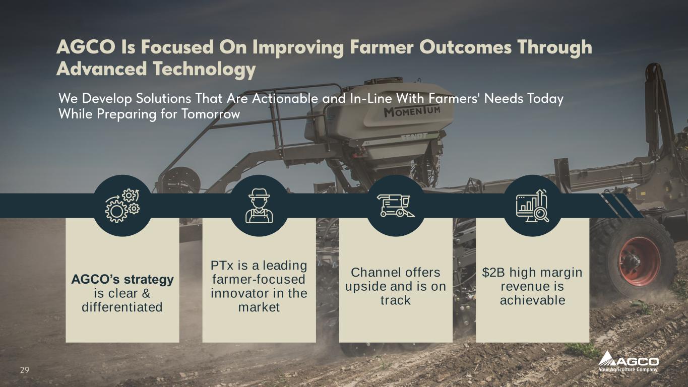 Precision AG技术的采用正在加速PTX 天宝导航合资公司进一步提高用户体验和对农民的价值Fendt期权已售&净销售丨爱科AGCO工厂采用天宝导航接收器的指导精度解锁9068 202120222023期权已售净销售额2024年1月2024年4月2024年11月2024年11月60% 202202220232024农民:额外精准农业产品的能力AGCO:增加精准农业产品销售的机器数量农民:集成用户和支持体验丨爱科AGCO:简化支持和经销商能力•近2x在交易公告中表示Value Proposition Farmers:更高的精确度级别可提高农民生产力AGCO:高利润的软件收入•与交易模型相比实现近2倍的期权费率28