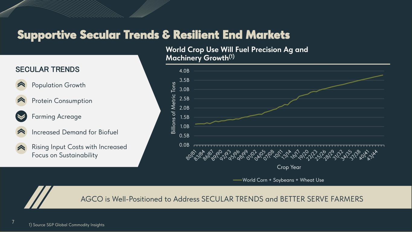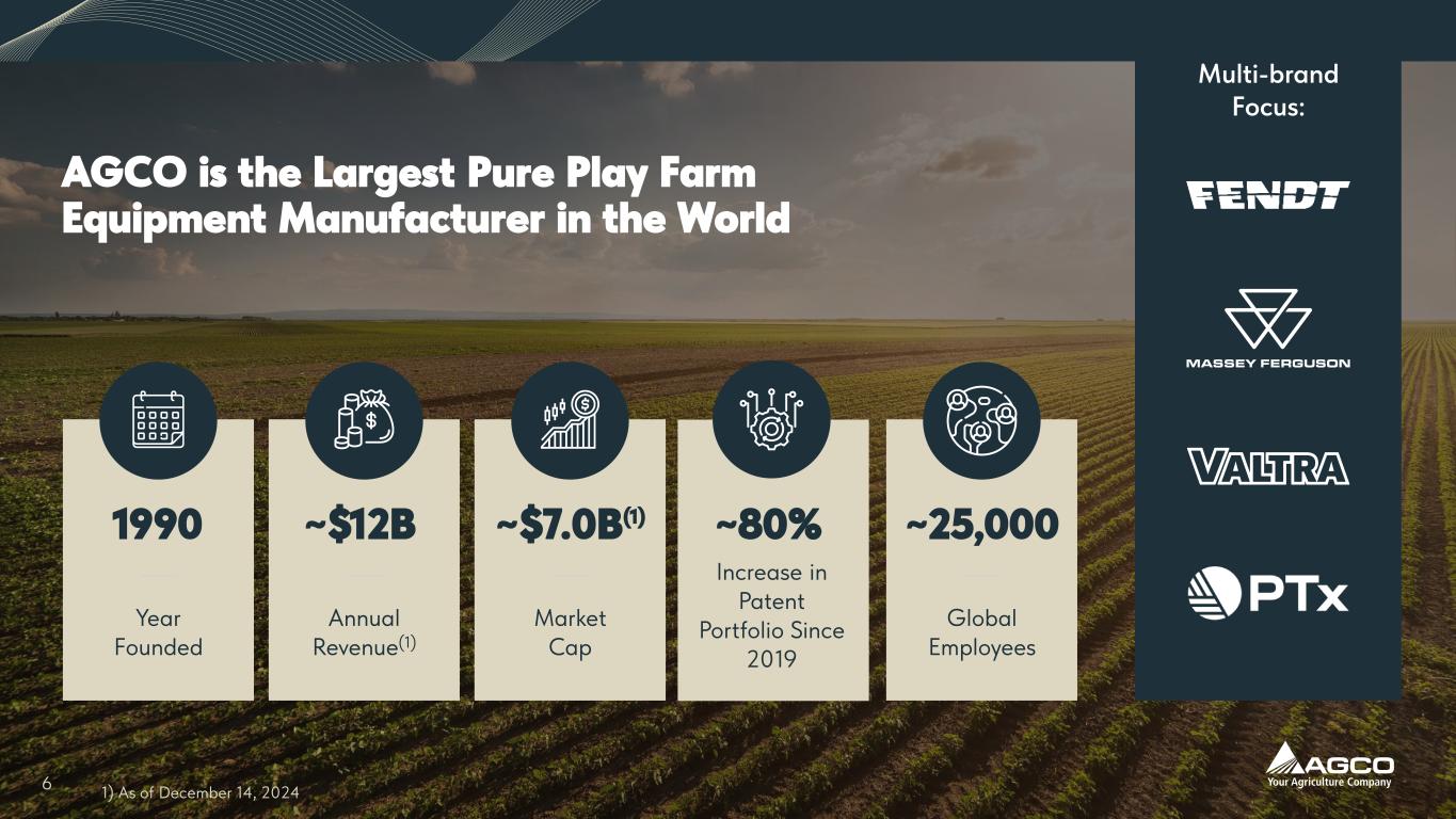 AGCO是全球最大的Pure Play农场设备制造商多品牌聚焦:~25,000名全球员工1990年成立~$ 12B年收入(1)自2019年以来专利组合增加~$ 7.0B(1)市值6~80% 1)截至2024年12月14日