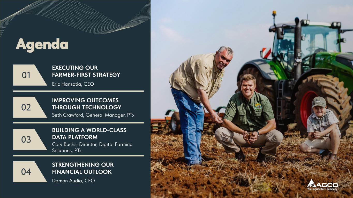 投资者日议程加强我们的财务前景Damon Audia,首席财务官,执行我们的农民至上战略Eric Hansotia,首席执行官01通过技术改善结果Seth Crawford,总经理,PTX 02构建世界级数据平台Cory Buchs,数字农业解决方案总监,PTX 0304