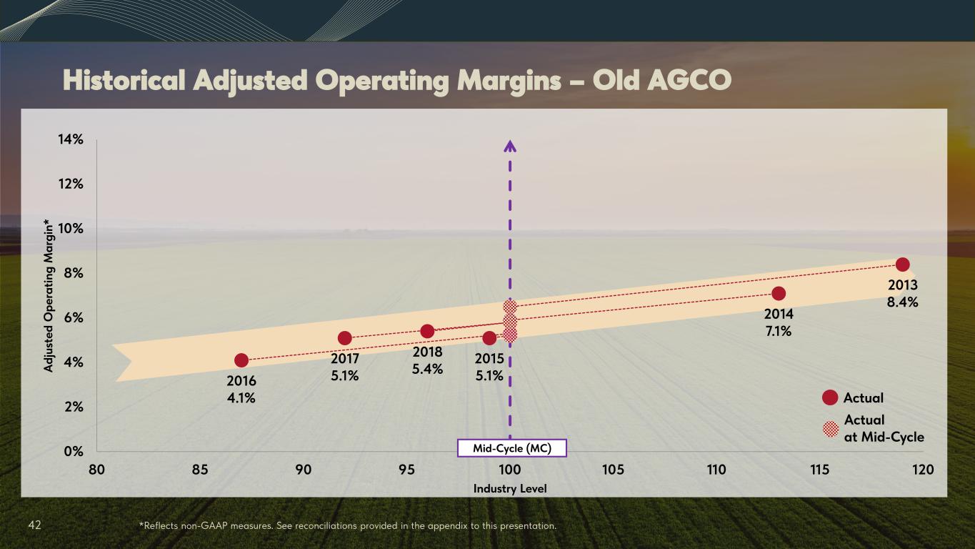 2013年8.4% 2014年7.1% 2015年5.1% 2016年4.1% 2017年5.1% 2018年5.4% 0% 2% 4% 6% 8% 10% 12% 14% 80859095100105110115120 A DJ US te d o pe ra ti ng m ar gi n*行业水平中周期(MC)在中周期的实际实际历史调整后营业利润率–老AGCO 42*反映非公认会计原则措施。见本演示文稿附录中提供的对账。