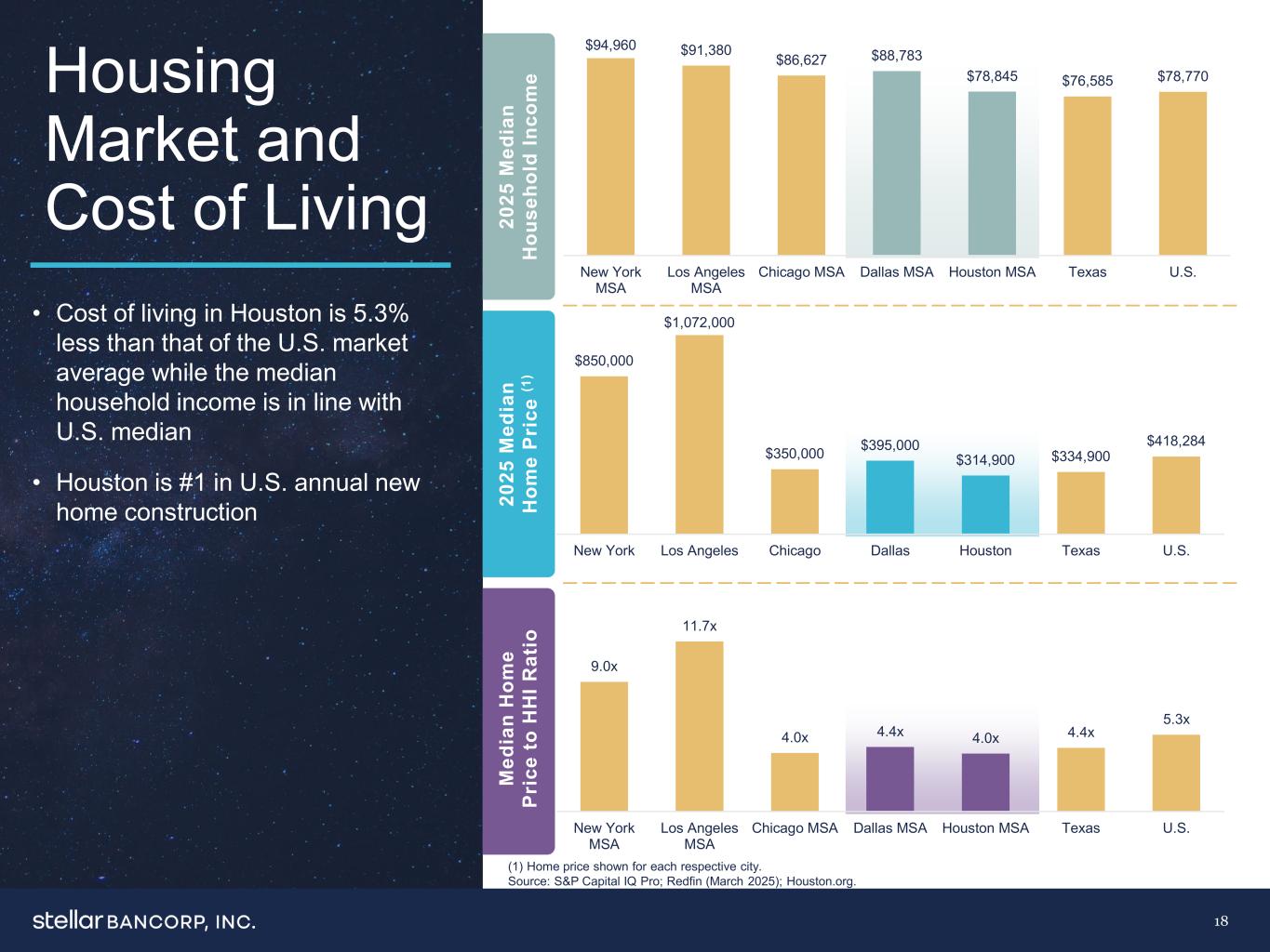 $ 94,960 $ 91,380 $ 86,627 $ 88,783 $ 78,845 $ 76,585 $ 78,770 New York,Los Angeles,Los Angeles,MSA,072,000 $ 350,000 $ 350,000 $ 395,000 $ 314,900 $ 334,900 $ 418,284 New York,Los Angeles,Chicago,Dallas,Houston,Texas U.S. 9.0x 11.7x 4.0x 4.4x 4.0x 4.4x 5.3x New York,MSA,Los Angeles,MSA,Chicago,MSA,Dallas,MSA,Houston,MSA,Texas US Housing Market and Living Cost 18 • Houston的生活成本比美国市场平均水平,而家庭收入中位数与美国中值一致•休斯顿在美国年度新房建设中排名第一2025m ed ia n h ou se ho ld in co m e 2025m ed ia n h om e pr ic e(1)m ed ia n h om e p r ce to h h h i r at io(1)显示的每个相应城市的房价。资料来源:标普 Capital IQ Pro;Redfin(2025年3月);Houston.org。