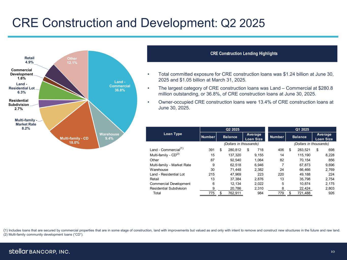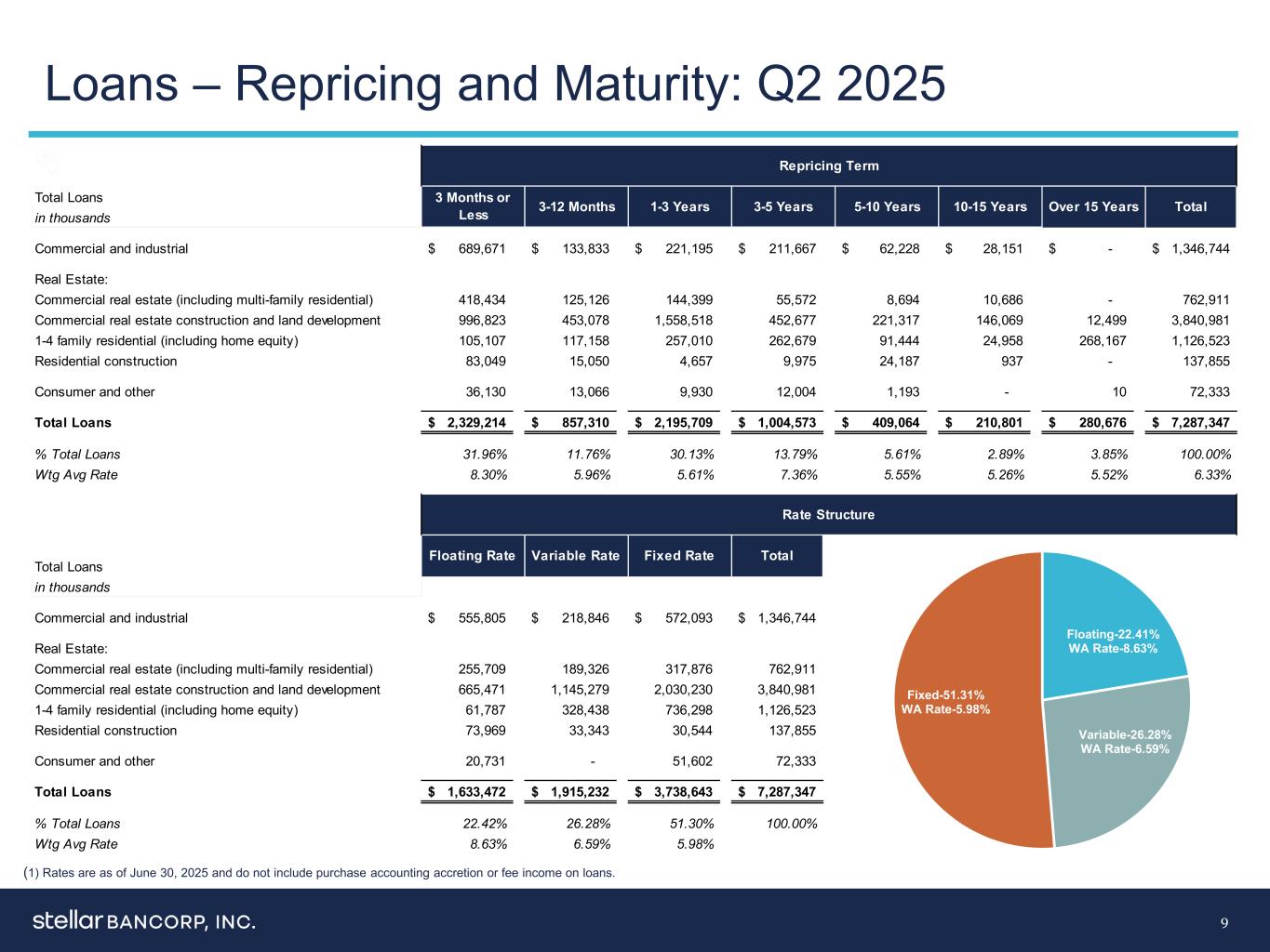 9贷款–重新定价和到期:2025年第二季度(1)费率截至2025年6月30日,不包括贷款的采购会计增值或费用收入。浮动-22.41 % WA Rate-8.63 % Variable-26.28 % WA Rate-6.59 % Fixed-51.31 % WA Rate-5.98 % Total Loans in Thousands Commercial and Industrial 689,671 $ 133,833 $ 221,195 $ 211,667 $ 62,228 $ 28,151 $-$ 1,346,744 $ Real Estate:Commercial Real Estate(including multi-family residential)418,434125,126144,39955,5728,69410,686-762,911 Commercial Real Estate Construction and Land Development 996,823453,0781,558,518452,及其他36,13013,0669,93012,0041,193-1072,333贷款总额2,329,214 $ 857,310 $ 2,195,709 $ 1,004,573 $ 409,064 $ 210,801 $ 280,676 $ 7,287,347$%贷款总额31.96% 11.76% 30.13% 13.79% 5.61% 2.89% 3.85% 100.00% WTG Avg Rate 8.30% 5.96% 5.61% 7.36% 5.55% 5.26% 5.52% 6.33% Total loans in thousand commercial and industrial 555,805 $ 218,846 $ 572,093 $ 1,346,744 $ real estate:commercial real estate(including multi-family residential)255,709189,3及其他20,731-51,60272,333贷款总额1,633,472美元1,915,232美元3,738,643美元7,287,347$%贷款总额22.42% 26.28% 51.30% 100.00% WTG平均利率8.63% 6.59% 5.98% 10-15年超过15年重定价期限总计3个月或更短3-12个月1-3年3-5年5-10年利率Structure浮动利率浮动利率总计固定利率
