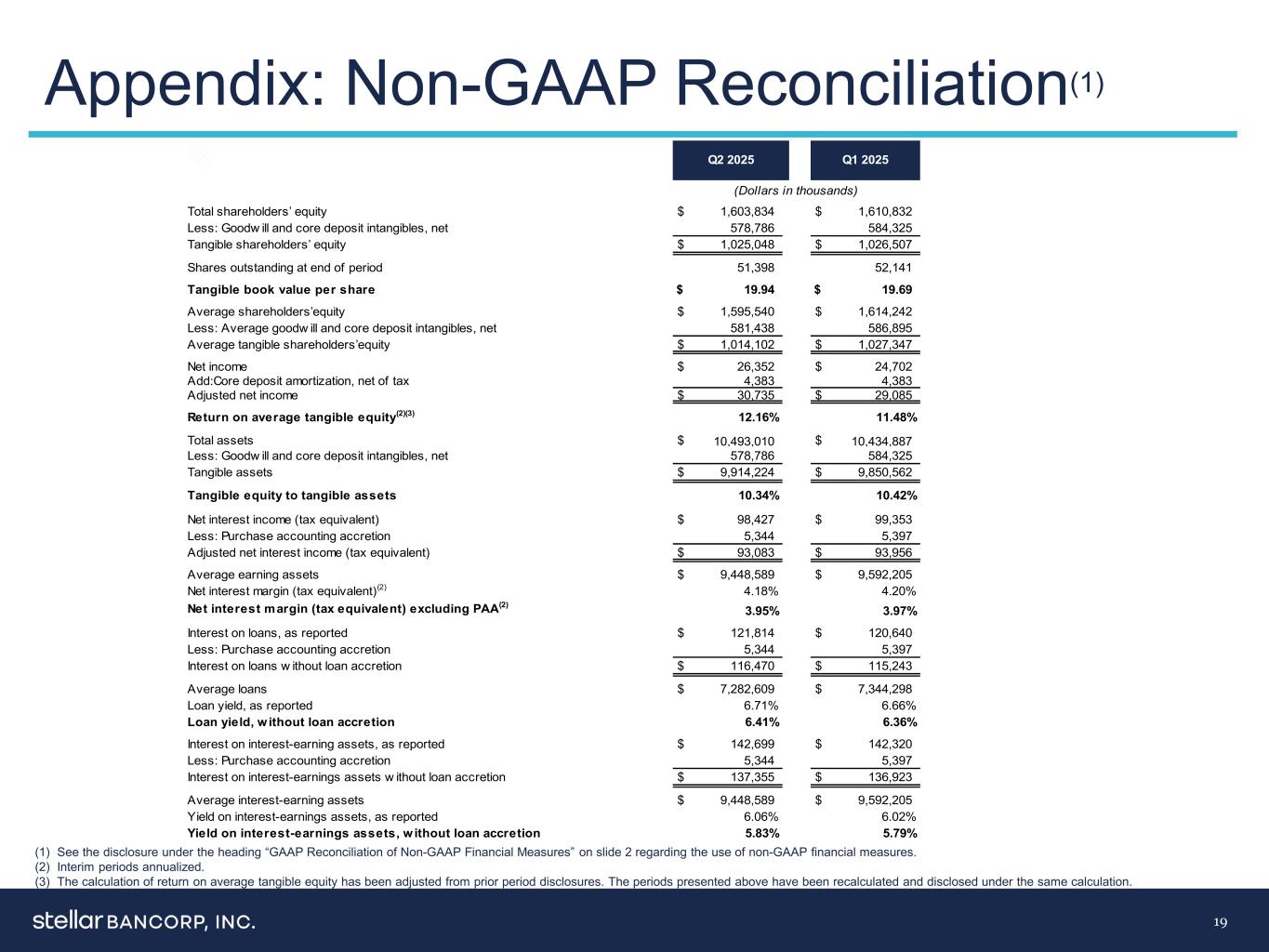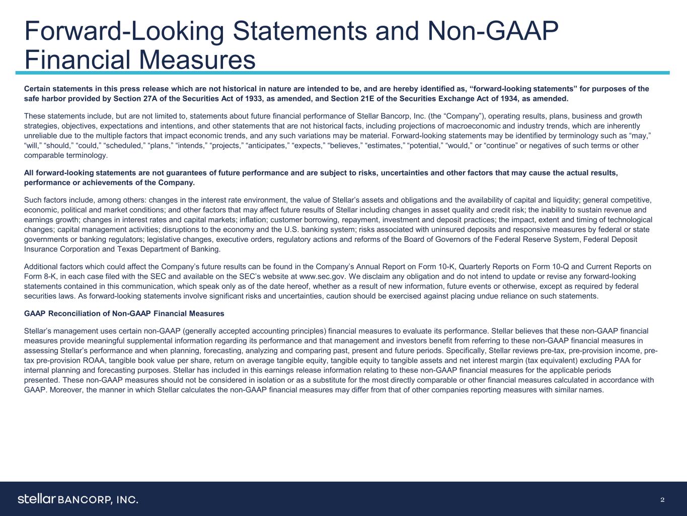 前瞻性陈述和非公认会计原则财务措施2本新闻稿中的某些非历史性质的陈述旨在成为,并在此被确定为“前瞻性陈述”,以实现经修订的1933年《证券法》第27A条和经修订的1934年《证券交易法》第21E条提供的安全港。这些陈述包括但不限于关于Stellar Bancorp,Inc.(“公司”)未来财务业绩、经营业绩、计划、业务和增长战略、目标、期望和意图的陈述,以及其他非历史事实的陈述,包括对宏观经济和行业趋势的预测,由于影响经济趋势的多重因素,这些陈述本质上是不可靠的,任何此类变化都可能是重大的。前瞻性陈述可以通过诸如“可能”、“将”、“应该”、“可能”、“计划”、“计划”、“打算”、“项目”、“预期”、“预期”、“相信”、“估计”、“潜在”、“将”或“继续”等术语来识别,或否定此类术语或其他类似术语。所有前瞻性陈述都不是对未来业绩的保证,并受到可能导致公司实际结果、业绩或成就的风险、不确定性和其他因素的影响。这些因素包括,除其他外:利率环境的变化、Stellar资产和债务的价值以及资本和流动性的可用性;一般竞争、经济、政治和市场条件;以及可能影响Stellar未来业绩的其他因素,包括资产质量和信用风险的变化;收入和盈利增长无法持续;利率和资本市场的变化;通货膨胀;客户借款、还款、投资和存款做法;影响,技术变革的程度和时机;资本管理活动;对经济和美国银行体系的破坏;与无保险存款相关的风险以及联邦或州政府或银行监管机构的应对措施;联邦储备系统理事会、联邦存款保险公司和得州银行部的立法变化、行政命令、监管行动和改革。可能影响公司未来业绩的其他因素可在公司提交给SEC的每个案例中的10-K表格年度报告、10-Q表格季度报告和8-K表格当前报告中找到,并可在SEC网站www.sec.gov上查阅。我们不承担任何义务,也不打算更新或修改本通讯中包含的任何前瞻性陈述,这些陈述仅在本新闻稿发布之日发表,无论是由于新信息、未来事件或其他原因,除非联邦证券法要求。由于前瞻性陈述涉及重大风险和不确定性,应谨慎行事,不要过分依赖此类陈述。非GAAP财务指标的GAAP调节Stellar的管理层使用某些非GAAP(公认会计原则)财务指标来评估其业绩。Stellar认为,这些非GAAP财务指标提供了有关其业绩的有意义的补充信息,管理层和投资者在评估Stellar的业绩以及在规划、预测、分析和比较过去、现在和未来期间时参考这些非GAAP财务指标将从中受益。具体而言,Stellar审查税前、拨备前收入、税前拨备前ROAA、每股有形账面价值、平均有形股本回报率、有形股本与有形资产的比率以及不包括PAA的净息差(税收等值),以用于内部规划和预测目的。Stellar已在本财报发布中包含了与这些适用期间的非GAAP财务指标相关的信息。不应孤立地考虑这些非GAAP衡量标准,也不应替代最直接可比的或根据GAAP计算的其他财务衡量标准。此外,Stellar计算非美国通用会计准则财务指标的方式可能与其他名称相似的公司报告指标的方式不同。