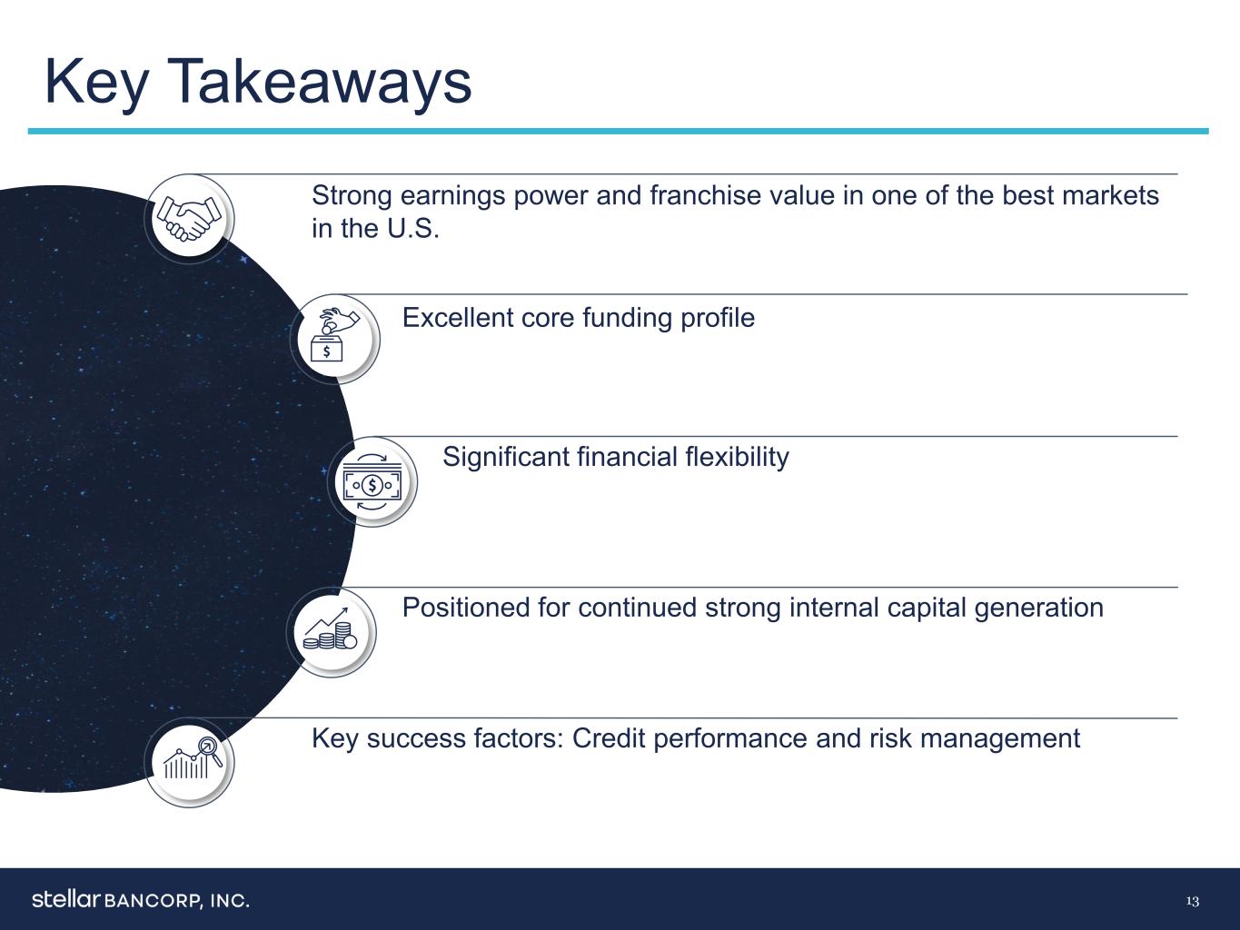 13个关键要点优秀的核心融资概况在美国最好的市场之一拥有强大的盈利能力和特许经营价值关键成功因素:信贷表现和风险管理显着的财务灵活性定位于持续强劲的内部资本生成