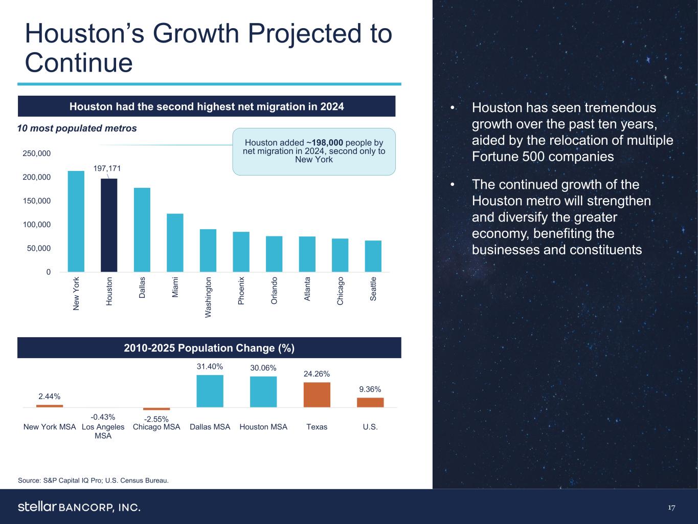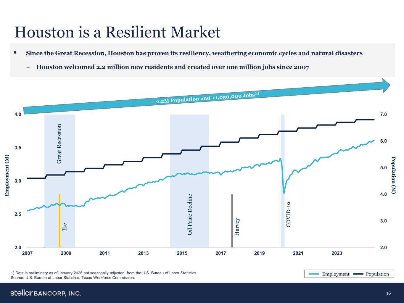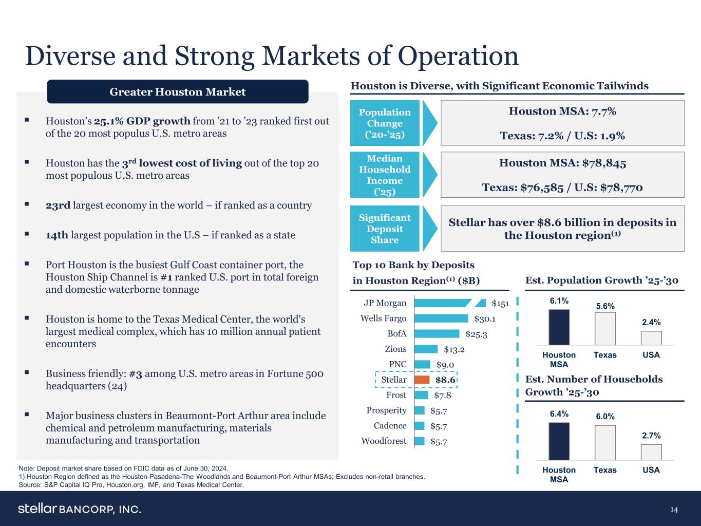 5.7美元5.7美元5.7美元5.7美元7.8美元8.6美元9.0美元13.2美元25.3美元30.1美元151美元Woodforest Cadence Prosperity Frost Stellar PNC Zions BoA美银富国银行 JP Morgan 6.1% 5.6% 2.4%休斯顿MSA德克萨斯美国6.4% 6.0% 2.7%休斯顿MSA德克萨斯美国14号行动的市场多元化且强劲,经济顺风明显大休斯顿市场休斯顿从21年到23年GDP增长25.1%在美国人口最多的20个都会区中排名第一休斯顿的生活成本在美国人口最多的前20个都会区中排名第3 ——如果被列为美国人口第14大的国家——如果被列为州港口休斯顿是墨西哥湾沿岸最繁忙的集装箱港口,休斯顿船舶航道在美国港口国内外水运总吨位排名第一休斯顿是全球最大的医疗综合体德克萨斯医疗中心的所在地,该中心每年有1000万人次的患者就诊商业友好:在《财富》500强总部的美国都会区中排名第三(24)博蒙特-亚瑟港地区的主要商业集群包括化学和石油制造、材料制造和运输休斯顿地区存款排名前10的银行(1)($ B)注:存款市场份额基于截至2024年6月30日的FDIC数据。1)休斯顿地区定义为休斯顿-帕萨迪纳-伍德兰兹和博蒙特-亚瑟港MSA;不包括非零售分支。资料来源:标普 Capital IQ Pro,Houston.org,IMF,德州医疗中心。美东时间。人口增长‘25-’30 EST。Households Growth‘25-’30 Population Change(‘20-’25)Median Household Income(' 25)Significant Deposit Share休斯顿MSA:7.7%德克萨斯:7.2%/美国:1.9%休斯顿MSA:78,845美元德克萨斯:76,585美元/美国:78,770美元Stellar在休斯顿地区拥有超86亿美元的存款(1)