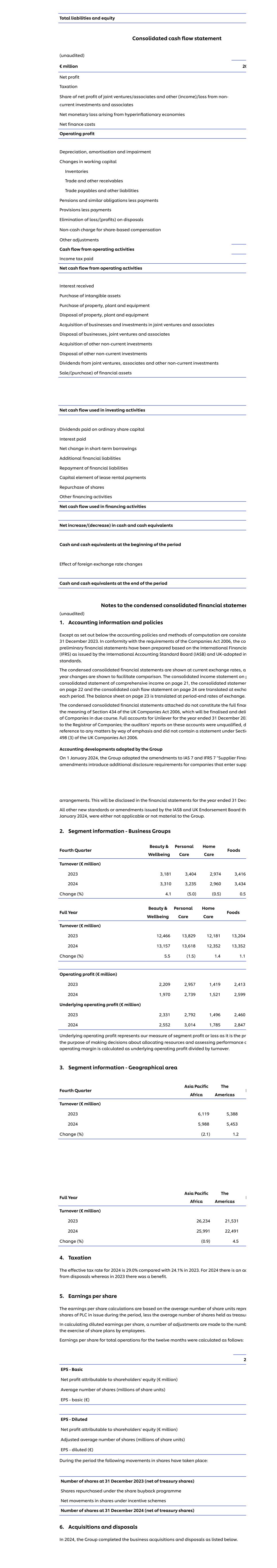 (c)合并现金流量表(未经审计)百万欧元20净利润应占合营企业/联营企业净利润及其他(收益)/非流动投资和联营企业亏损的税收恶性通货膨胀经济产生的货币净亏损净财务成本营业利润折旧,营运资金摊销及减值变动存货贸易及其他应收款贸易应付款项及其他负债退休金及类似债务减付款拨备减付款抵销出售损失/(利润)以股份为基础的补偿的非现金费用其他调整经营活动产生的现金流量已付所得税经营活动产生的现金流量净额已收利息购买无形资产购买物业、厂房及设备出售物业、厂房及设备收购业务及投资合营企业及联营企业处置业务,合营企业和联营企业收购其他非流动投资处置其他非流动投资合营企业分红、联营企业和其他非流动投资出售/(购买)金融资产用于投资活动的现金流量净额支付的普通股本股利支付的利息支付的短期借款净变动额外的金融负债偿还金融负债租赁租金付款的资本要素回购股份其他筹资活动用于筹资活动的现金流量净额现金及现金等价物增加/(减少)期初现金及现金等价物外汇汇率变动的影响期末现金及现金等价物简明综合财务报表附注(未经审计)1。会计信息和政策除下列情况外,会计政策和计算方法一致2023年12月31日。根据《2006年公司法》的要求,共同初步财务报表是根据国际会计准则理事会(IASB)发布的国际财务报告准则(IFRS)和英国采用的准则编制的。简明合并财务报表以当前汇率列示,显示一年的变化以便于比较。第21页p上的合并损益表、第22页上的合并报表和第24页上的合并现金流量表在各期excha换算。第23页的资产负债表按期末汇率换算。随附的简明综合财务报表并不构成《2006年英国公司法》第434条的全部财务含义,该条将在适当时候最终确定并交付公司。联合利华向公司注册处处长提交的截至202年12月31日止年度的完整账目;审计师对这些账目的报告是无保留的,d以强调的方式提及任何事项,并且不包含根据2006年英国公司法第498(3)条作出的声明。集团于2024年1月1日采纳的会计发展,集团采纳了国际会计准则第7号和国际财务报告准则第7号的修订《供应商财务报告准则修订》,为进入供应安排的公司引入了额外的披露要求。这将在截至12月31日止年度的财务报表中披露IASB和英国认可委员会于2024年1月发布的所有其他新准则或修订, 不适用或对集团不重要。2.分部信息-业务集团第四季度Beauty & Wellbeing Personal Care Home Care Foods营业额(百万欧元)20233,1813,4042,9743,41620243,3103,2352,9603,434变化(%)4.1(5.0)(0.5)0.5全年Beauty & Wellbeing Personal Care Home Care Foods营业额(百万欧元)202312,46613,82912,18113,204202413,15713,61812,35213,352变化(%)5.5(1.5)1.4 1.1营业利润(百万欧元)20232,2092,9571,4192,41320241,9702,7391,5212,599基础营业利润(百万欧元)20232,3312,7921,49分部利润或亏损,因为它是公关作出有关分配资源和评估业绩的决策的目的o营业利润率的计算方法是基础营业利润除以营业额。3.分部信息-地理区域第四季度亚太非洲美洲E营业额(百万欧元)20236,1195,38820245,9885,453变化(%)(2.1)1.2全年亚太非洲美洲E营业额(百万欧元)202326,23421,531202425,99122,491变化(%)(0.9)4.54。税收2024年的实际税率为29.0%,而2023年为24.1%。2024年有一个来自处置的广告,而2023年有一个好处。5.每股收益每股收益的计算是根据该期间已发行的PLC的平均股份单位repre股份数量,减去计算稀释每股收益时作为财务部门持有的平均股份数量,对员工行使股份计划的麻木情况进行了多项调整。总运营的每股收益计算了十二个月的如下:2 EPS-归属于股东权益的基本净利润(百万欧元)平均股数(百万股单位)EPS-基本(欧元)EPS-归属于股东权益的稀释净利润(百万欧元)调整后的平均股数(百万股单位)EPS-稀释后(欧元)期间发生了以下股份变动:截至2023年12月31日的股份数量(扣除库存股)根据股份回购计划回购的股份根据激励计划回购的股份净变动2024年12月31日的股份数量(扣除库存股)6。收购及出售事项于2024年,集团完成以下所列业务收购及出售事项。