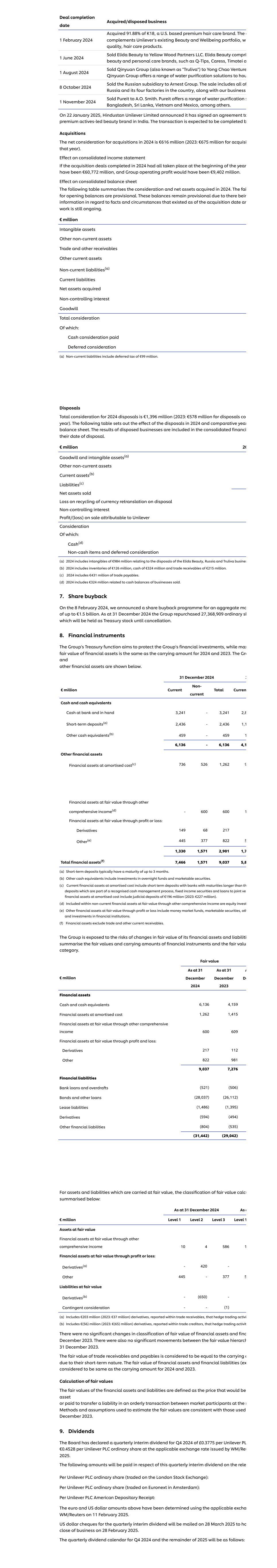交易完成日期收购/处置业务2024年2月1日收购美国优质护发品牌K18 91.88%的股份。A与联合利华现有的美容和健康产品组合、Wi-Fi质量、护发产品相辅相成。2024年6月1日将Elida Beauty出售给Yellow Wood Partners LLC。Elida Beauty compri beauty and personal care brands,such as Q-Tips,Caress,Timotei a 1 August 2024 sold Qinyuan Group(also known as“Truliva”)to Yong Chao Venture Qinyuan Group offers a range of water purification solutions to hou 8 October 2024 sold the Russian subsidiary to Arnest Group。此次出售包括俄罗斯全境及其在该国的四家工厂,以及我们的业务2024年11月1日将Pureit出售给A.O.史密斯。Pureit提供一系列净水服务,如孟加拉国、斯里兰卡、越南和墨西哥等。2025年1月22日,印度斯坦联合利华有限公司宣布已签署一项协议,在印度推出以活动为主导的高级美容品牌。预计交易将完成b收购2024年收购的净对价为6.16亿欧元(2023年:当年收购的净对价为6.75亿欧元)。如果2024年完成的收购交易都发生在年初,则对合并损益表的影响为607.72亿欧元,集团营业利润为94.02亿欧元。对合并资产负债表的影响下表汇总了2024年收购的对价和净资产。期初余额的FAI是暂定的。这些余额仍然是暂时性的,因为有关于截至收购日期存在的事实和情况的信息,一项工作仍在进行中。百万欧元无形资产其他非流动资产贸易和其他应收款其他流动资产非流动负债(a)流动负债净资产收购的非控股权益商誉总对价其中:支付的现金对价递延对价(a)非流动负债包括递延税项9900万欧元。出售事项2024年出售事项的总对价为13.96亿欧元(2023年:出售事项同比5.78亿欧元)。下表列出了2024年和比较年度资产负债表的处置影响。处置业务的结果计入合并财务i其处置日期。百万欧元20商誉和无形资产(a)其他非流动资产流动资产(b)负债(c)出售的净资产处置时回收货币重新换算的损失非控股权益应占出售利润/(亏损)联合利华对价其中:现金(d)非现金项目和递延对价(a)2024年包括与处置Elida Beauty、俄罗斯和Truliva业务有关的9.84亿欧元无形资产(b)2024年包括1.26亿欧元的存货、3.24亿欧元的现金和2.15亿欧元的贸易应收账款。(c)2024年包括4.31亿欧元的贸易应付款项。(d)2024年包括与出售业务的现金余额相关的3.24亿欧元。7.股票回购2024年2月8日,我们宣布了一项股票回购计划,总金额高达15亿欧元。截至2024年12月31日,集团回购了27,368,909股普通股,将作为库存股持有直至注销。8.金融工具集团的库务职能旨在保障集团的金融投资,而金融资产的最大公允价值与2024年及2023年的账面值相同。Gro和其他金融资产如下所示。2024年12月31日3欧元百万流动非流动总额Curren现金和现金等价物银行现金在手3,241-3,2412,8短期存款(a)2,436-2,4361,1其他现金等价物(b)459-45916,136-6,1364,1其他金融资产以摊余成本计量的金融资产(c)7365261,2629以公允价值计量且其变动计入其他综合收益的金融资产(d)-6006001以公允价值计量且其变动计入损益的金融资产:衍生工具14968217其他(e)44537782251,3301,5712,9011,7金融资产总额(f)7,4661,5719,0375,8(a)短期存款的期限通常长达3个月。(b)其他现金等价物包括对隔夜资金和有价证券的投资。(c)按摊余成本计算的流动金融资产包括期限长于银行的短期存款,这些存款是公认的现金管理过程的一部分,固定收益证券和按摊余成本计算的对联芬金融资产的贷款包括1.96亿欧元的司法存款(2023年:2.27亿欧元)。(d)计入以公允价值计量且其变动计入其他综合收益的非流动金融资产为股权投资(e)以公允价值计量且其变动计入损益的其他金融资产包括货币市场基金、有价证券、 oth和对金融机构的投资。(f)金融资产不包括贸易和其他流动应收款。本集团面临金融资产和负债的公允价值变动风险i汇总金融工具的公允价值和账面金额及公允价值类别。公允价值百万欧元截至2024年12月31日截至2023年12月31日A De金融资产现金及现金等价物6,1364,159以摊余成本计量的金融资产1,2621,415以公允价值计量且其变动计入其他综合收益的金融资产600609以公允价值计量且其变动计入损益的金融资产:衍生工具217112其他8229819,0377,276金融负债银行借款及透支(521)(506)债券及其他借款(28,037)(26,112)租赁负债(1,486)(1,395)衍生工具(594)(494)其他金融负债(804)(535)(31,442)(29,042)对于以公允价值计量的资产和负债,公允价值的分类calcu总结如下:截至2024年12月31日,作为百万欧元的一级1级2级3级1级以公允价值计量且其变动计入其他综合收益的金融资产1045861以公允价值计量且其变动计入损益的金融资产:衍生工具(a)-420-其他445-3775以公允价值计量的负债衍生工具(b)-(650)-或有对价--(1)(a)包括2.03亿欧元(2023年:3700万欧元)的衍生工具,在贸易应收账款中报告,对冲交易活动i(b)包括(56)百万欧元(2023年:65)百万欧元的衍生工具,贸易债权人内部报告称,对冲交易活动金融资产公允价值分类和国际财务报告准则2023年12月未发生重大变化。公允价值等级之间也没有重大变动2023年12月31日。贸易应收款项和应付款项的公允价值因其短期性而被视为与账面a相等。金融资产和金融负债的公允价值(ex被认为与2024年和2023年的账面值相同。公允价值的计算金融资产和负债的公允价值被定义为市场参与者之间在m的有序交易中为转移一项负债而将成为资产或支付的价格用于估计公允价值的方法和假设与2023年12月所使用的方法和假设一致。9.股息董事会已宣布按WM/Reu 2