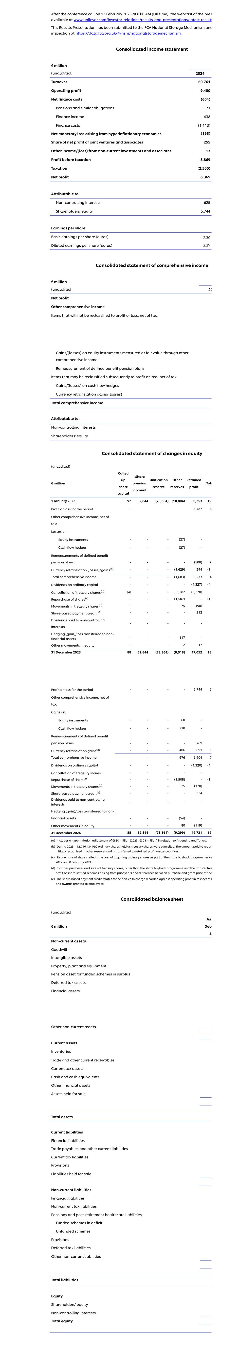 在2025年2月13日上午8:00(英国时间)的电话会议结束后,可在www.unilever.com/investor-relations/results-and-presentations/latest-results上观看pres的网络直播。该结果演示文稿已提交给FCANational Storage机制并在https://data.fca.org.uk/#/nSM/nationalstoragemechanism进行检查。合并利润表百万欧元(未经审计)2024年营业额60,761营业利润9,400净财务成本(604)养老金和类似义务71财务收入438财务成本(1,113)恶性通货膨胀经济产生的货币净亏损(195)应占合营企业和联营企业净利润255非流动投资的其他收入/(亏损)及联营公司13除税前溢利8,869税项(2,500)纯利6,369归属于:非控股权益625股东权益5,744每股收益基本每股收益(欧元)2.30稀释每股收益(欧元)2.29综合全面收益表百万欧元(未经审计)20净利润其他综合收益项目不会重分类进损益的税后净额:以公允价值计量且其变动计入其他综合收益的权益工具的收益/(损失)设定受益养老金计划项目的重新计量后续可能重分类进损益的项目,税后净额:现金流量套期收益/(亏损)货币重换算收益/(亏损)综合收益总额归属于:非控股权益股东权益合并权益变动表(未经审计)百万欧元调高股本股份溢价账户统一储备其他储备留存利润合计2023年1月1日9252,844(73,364)(10,804)50,25319,本期损益---6,4876其他综合收益,税后净额:损失:权益工具---(27)-现金流量套期保值--(27)-重新计量设定受益养老金计划---(508)(5货币重新换算(损失)/收益(a)---(1,629)294(1,3综合收益总额---(1,683)6,2734普通资本股息----(4,327)(4,3注销库存股(b)(4)--5,282(5,278)回购股份(c)--(1,507)-(1,5库存股变动(d)---75(98)股份支付贷记(e)----212支付给非控股权益的股息----套期保值(收益)/损失转入非金融资产---117-其他权益变动---2172023年12月31日8852,844(73,364)(8,518)47,05218,本期损益----5,7445其他综合收益,税后净额:收益:权益工具---60-现金流对冲---210-重新计量设定受益养老金计划----269货币重新换算收益(a)---4068911综合收益总额---6766,9047普通资本股息----(4,320)(4,3注销库存股-----回购股份(c)---(1,508)-(1,5库存股变动(d)---25(120)股份支付贷记(e)---324支付给非控股权益的股息-----转入非金融资产的套期保值(收益)/损失---(54)-其他权益变动---80(119)2024年12月31日8852,844(73,364)(9,299)49,72119,(a)包括与阿根廷和土耳其有关的8.8亿欧元(2023年:3.08亿欧元)的恶性通货膨胀调整。(b)2023年期间,作为库存股持有的112,746,434股PLC普通股被注销。支付给repurc的金额最初在其他储备中确认,并在注销时转入留存利润。(c)回购股份反映了在2022年和2024年2月8日作为股份回购计划的一部分购买普通股的成本。(d)包括库存股的购买和销售,但股份回购计划和以前年度产生的股份结算计划的利润转移以及购买和授予价格之间的差异除外(e)以股份为基础的支付贷记与就t和授予雇员的奖励在营业利润中记录的非现金费用有关。合并资产负债表(未经审计)百万欧元作为Dece2非流动资产商誉无形资产财产, 厂房及设备盈余中供资计划的养老资产递延税项资产金融资产其他非流动资产流动资产存货贸易及其他流动应收款项流动税项资产现金及现金等价物其他金融资产持作出售的资产总资产流动负债金融负债贸易应付款项及其他流动负债流动税项负债拨备持作出售的负债非流动负债金融负债非流动税项负债养老金及退休后医疗保健负债:赤字中供资计划未供资计划拨备递延税项负债其他非流动负债总负债权益股东权益非控股权益总权益