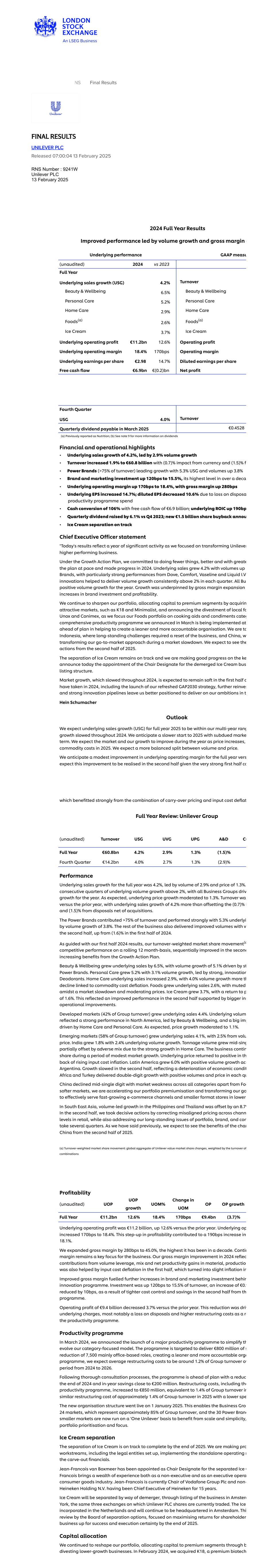 RNS最终业绩最终结果联合利华PLC发布2025年2月13日07:00:04RNS编号:9241W Unilever Plc 2025年2月13日2024年全年业绩在销量增长的带动下业绩有所改善和毛利率e基本业绩GAAP衡量(未经审计)2024年与2023年全年基本销售增长(USG)4.2%营业额Beauty & Wellbeing 6.5% Beauty & Wellbeing Personal Care 5.2% Personal Care Home Care 2.9% Home Care Foods(a)2.6% Foods(a)Ice Cream 3.7% Ice Cream基本营业利润112亿欧元12.6%营业利润基本营业利润率18.4% 170bps基本每股收益2.98 14.7%稀释每股收益自由现金流69亿欧元(0.2)亿净利润第四季度USG 4.0%营业额2025年3月应付的季度股息0.4528欧元(a)之前报告为Nutrition;(b)见附注9欲了解有关股息的更多信息财务和运营亮点•基础销售额增长4.2%,销量增长2.9%领先•营业额增长1.9%至608亿欧元,其中(0.7)%受汇率影响,(1.5)% f • Power Brands(>营业额的75%)以5.3%的USG和销量增长3.8%领先增长•品牌和营销投资增长120bps至15.5%,为逾十年来的最高水平•基础运营利润率增长170bps至18.4%,毛利率上升280bps •基本每股收益增长14.7%;稀释后每股收益下降10.6%,原因是处置生产力计划支出的损失•现金转换为106%,自由现金流69亿欧元;基本ROIC上升190bp •季度股息较2023年第四季度提高6.1%;新的15亿欧元股票回购annou •冰淇淋分离步入正轨首席执行官声明“今天的业绩反映了这一年的重大活动,因为我们专注于转型表现更好的业务联合利华。在增长行动计划下,我们承诺做更少的事情,做得更好,与大计划同步,并在2024年取得进展。基础销售额增长4.2%,销量增长2个品牌,Dove、Comfort、凡士林和Liquid I.V.创新的表现尤其强劲,帮助每个季度的销量增长始终保持在2%以上。全年全部BU正量增长。增长受到品牌投资和盈利能力的毛利率扩张支撑。我们继续加强我们的投资组合,通过收购有吸引力的市场(例如K18和Minimalist)将资本分配给高端细分市场,并宣布剥离当地的fo unox和conimex,因为我们将我们的食品投资组合集中在我们在3月份宣布的烹饪辅料和调味品categ综合生产力计划上,正在提前实施,以帮助创建一个更精简、更负责任的组织。我们是印度尼西亚,在那里长期存在的挑战需要重新调整业务,而中国在市场放缓期间转变了我们的上市方式。我们预计将从2025年下半年开始看到这些行动。冰淇淋的分离仍在轨道上,我们在ke上取得了良好进展,今天宣布任命分拆的冰淇淋巴士上市结构的候任主席。整个2024年放缓的市场增长预计将在2024年上半年保持疲软,包括推出我们更新的GAP2030战略、进一步重塑和强大的创新管道,使我们能够更好地实现我们在《海因·舒马赫展望》中的雄心。我们预计,2025年全年的基本销售增长(USG)将在我们整个2024年放缓的多年增长范围内。我们预计2025年开局将放缓,市场预期将减弱。我们预计,随着价格上涨,2025年的商品成本,市场和我们的增长将在年内有所改善。我们预计量价分化将更加均衡。我们预计全年基本营业利润率将略有改善,而预计这种改善将在下半年实现,因为上半年公司非常强劲,强劲地受益于结转定价和投入成本去平的组合全年回顾:联合利华集团(未经审计)营业额USG UVG UPG A & D CU全年608亿欧元4.2% 2.9% 1.3%(1.5)%第四季度142亿欧元4.0% 2.7% 1.3%(2.9)%业绩基础销售增长全年为4.2%,销量增长2.9%,价格增长1.3%。连续几个季度基本销量增长超过2%,所有业务集团都推动了这一年的增长。正如预期的那样,基本价格增长放缓至1.3%。营业额与上一年相比,基本销售额增长4.2%,抵消了(0.7)% i和(1.5)%的出售净额收购。实力品牌贡献了> 75%的营业额,表现强劲,为5.3%,销量增长3.8%。其余业务的销量也有所改善,v下半年,高于2024年上半年的(1.6)%。按照我们2024年上半年业绩的指引, 我们的营业额加权市场份额变动(在滚动12个月的基础上具有竞争力的表现,在增长行动计划带来的第二个不断增加的好处中连续改善。Beauty & Wellbeing基础销售额增长6.5%,销量增长5.1%,受ST Power Brands推动。个人护理增长5.2%,销量增长3.1%,强劲的创新除臭剂引领。家庭护理基础销售额增长2.9%,销量增长4.0%,更多的是与商品成本通缩相关的下降。食品的基本销售额增长了2.6%,在市场放缓和价格放缓的情况下表现平平。冰淇淋增长3.7%,p回归1.6%。这反映了在更大的客栈运营改善的支持下,下半年的业绩有所改善。发达市场(占集团营业额的42%)基本销售额增长4.4%。基础交易量反映了以Beauty & Wellbeing为首的北美地区的强劲表现,以及由家庭护理和个人护理推动的巨大影响。一如预期,价格涨幅放缓至1.1%。新兴市场(占集团营业额的58%)的基本销售额增长4.1%,同比增长2.5%。印度增长1.8%,基本销量增长2.4%。由于家庭护理业务的强劲增长,吨位增长在一定程度上被不利的组合所抵消。该业务在市场温和增长期间保持份额。在投入成本通胀上升的背景下,基础价格重回正值。拉丁美洲增长6.0%,销量正增长acr阿根廷。下半年增长放缓,反映出经济状况恶化非洲和土耳其实现了两位数的增长,每个季度的量价均为正值中国下降了中个位数,除了FOO更疲软的市场外,所有类别的市场都疲软,我们正在加速我们的产品组合高端化,并转变我们的Go,以有效服务于东南亚较低地区快速增长的电子商务渠道和较小的业态商店,菲律宾和泰国的销量带动的增长在下半年被8.7%的增长所抵消,我们采取了果断行动,纠正了零售中跨chann水平的错位定价,同时还要解决我们长期存在的产