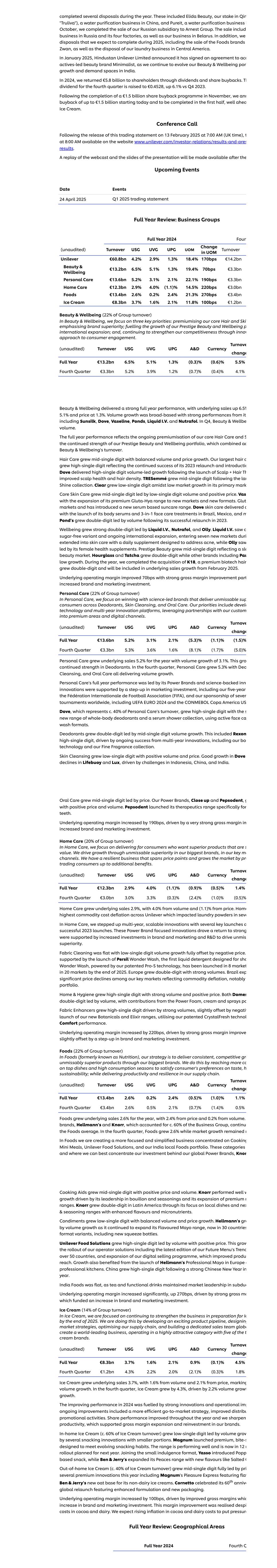 年内完成多项处置。其中包括我们在中国的净水业务秦“Truliva”)的股权Elida Beauty,以及净水业务Pureit i October,我们完成了向Arnest Group出售我们的俄罗斯子公司。此次出售包括在俄罗斯及其四家工厂的业务,以及我们在白俄罗斯的业务。此外,我们预计将在2025年完成的处置,包括出售Foods品牌Zwan,以及处置我们在中美洲的洗衣业务。2025年1月,印度斯坦联合利华有限公司宣布已与ACQ Actives-led美妆品牌Minimalist签署协议,因为我们将继续发展我们在印度的Beauty & Wellbeing港口增长和需求空间。2024年,我们通过股息和股票回购向股东返还了58亿欧元。第四季度股息上调至0.4528欧元,较2023年第四季度增长6.1%。继11月完成15亿欧元的股票回购计划后,我们从今天开始,将在上半年完成高达15亿欧元的回购,well ahea Ice Cream。电话会议继本交易声明于2025年2月13日上午7:00(英国时间)发布后,t上午8:00可在网站www.unilever.com/investor-relations/results-and-pres results上查阅。网络直播回放并将提供演示文稿的幻灯片即将发生的事件日期事件后2025年4月24日2025年第一季度交易报表全年回顾:业务集团2024年全年Fourt(未经审计)营业额USG UVG UPG UOM变动UOM营业额变化联合利华 608亿欧元4.2% 2.9% 1.3% 18.4% 170bps 142亿欧元Beauty & Wellbeing 132亿欧元6.5% 5.1% 1.3% 19.4% 70bps 33亿欧元个人护理136亿欧元5.2% 3.1% 2.1% 22.1% 190bps 33亿欧元家庭护理123亿欧元2.9% 4.0%(1.1)% 14.5% 220bps 30亿欧元食品134亿欧元2.6% 0.2% 2.4% 21.3% 270bps 34亿欧元冰淇淋83亿欧元3.7% 1.6% 2.1% 11.8% 100bps 12亿欧元Beauty & Wellbeing(集团营业额的22%)in Beauty & Wellbeing我们专注于三个关键优先事项:高端化我们的核心发型和滑雪,强调品牌优势;推动我们的Prestige Beauty and Wellbeing p国际扩张的增长;以及,通过对消费者参与的innov方法继续加强我们的竞争力。(未经审计)营业额USG UVG UPG A & D货币营业额变化全年132亿欧元6.5% 5.1% 1.3%(0.3)%(0.6)% 5.5%第四季度33亿欧元5.2% 3.9% 1.2%(0.7)%(0.4)% 4.1% Beauty & Wellbeing全年业绩表现强劲,基本销售额增长6.5% 5.1%,价格上涨1.3%。销量增长基础广泛,其表现强劲,包括Sunsilk、Dove、凡士林、Ponds、Liquid I.V.和Nutrafol。Q4,Beauty & Wellbe放量。全年业绩反映了我们核心护发产品的持续高端化,以及我们Prestige Beauty and Wellbeing产品组合的持续实力,这结合了AC Beauty & Wellbeing的营业额。护发实现中个位数增长,量价增长均衡。我们最大的头发c增长了高个位数,这反映了其2023年重新推出的持续成功,并且在推出Scalp + Hair TH后,Dove实现了高个位数的销量引领增长,改善了头皮健康和头发密度。Tresemm é在lau Shine系列之后增长了中个位数。Clear在其主要品牌Core Skin Care的低市场增长中以低个位数增长,在低个位数的数量和积极的价格的带动下以中个位数增长。VAS随着其优质Gluta-Hya系列扩展到新市场和新业态。Glut市场,并推出了一种新的基于血清的防晒系列。多芬护肤在巴西、墨西哥推出身体精华液和3合1面部护理治疗,实现了d交付,而m Pond在2023年成功重新推出后,在销量的带动下实现了两位数的增长。在Liquid I.V.、Nutrafol和Olly的带领下,Wellbeing实现了强劲的两位数增长。Liquid I.V. saw c无糖变种和正在进行的国际扩张,进入七个新市场duri扩展到皮肤护理,提供旨在解决痤疮的每日补充剂,而Olly saw由其女性健康补充剂引领。Prestige Beauty的增长为中个位数,反映了较慢的美容市场。Hourglass和Tatcha以两位数增长,而包括Pau在内的其他品牌则低增长。年内,我们完成了对K18的收购,这是一款优质的生物技术头发增长达到两位数,并将从2025年2月起计入基础销售增长。基础营业利润率改善70bps,毛利率改善强劲部分增加品牌和营销投入。个人护理(占集团营业额的22%)在个人护理方面,我们专注于赢得以科学为主导的品牌,这些品牌在除臭剂、皮肤清洁和口腔护理方面为消费者提供了不可错过的超级供应。我们的优先事项包括develo技术和多年创新平台, 利用与我们定制的合作伙伴关系进入高端领域和数字渠道。(未经审计)营业额USG UVG UPG A & D货币营业额变化全年136亿欧元5.2% 3.1% 2.1%(5.3)%(1.1)%(1.5)%第四季度33亿欧元5.3% 3.6% 1.6%(8.1)%(1.7)%(5.0)%个人护理全年基本销售额增长5.2%,销量增长3.1%。这个gro在除臭剂方面继续保持强势。第四季度个人护理与Deo Cleansing增长5.3%,口腔护理均实现销量增长。Personal Care的全年业绩由其强大的品牌引领,科学支持的INNO创新得到了营销投资的支持,包括我们为期五年的国际足联(FIFA),以及我们在全球范围内赞助的赛弗锦标赛,包括UEFA EURO 2024和CONMEBOL美洲杯美国鸽子,占Personal Care营业额的约40%,凭借其全新的全身除臭剂系列和使用主动洗脸形式的血清淋浴系列,实现了高个位数增长。除臭剂在中单位数销量增长的带动下实现两位数增长。这包括Rexon高个位数,这得益于多年创新的持续成功,包括我们的bo技术和我们的Fine Fragrance系列。护肤品量价齐升低个位数增长。受印度尼西亚、中国和印度挑战的推动,Dove的良好增长导致救生圈和勒克斯的下滑。口腔护理在价格带动下实现中个位数增长。我们的动力品牌,close up and Pepsodent,g with positive price and volume。Pepsodent推出了专门针对牙齿的治疗系列。基础营业利润率增长190bps,受非常强劲的毛利率推动,同时增加了品牌和营销投资。居家护理(占集团营业额的20%)居家护理中,我们专注于为想要优越产品的消费者提供物超所值