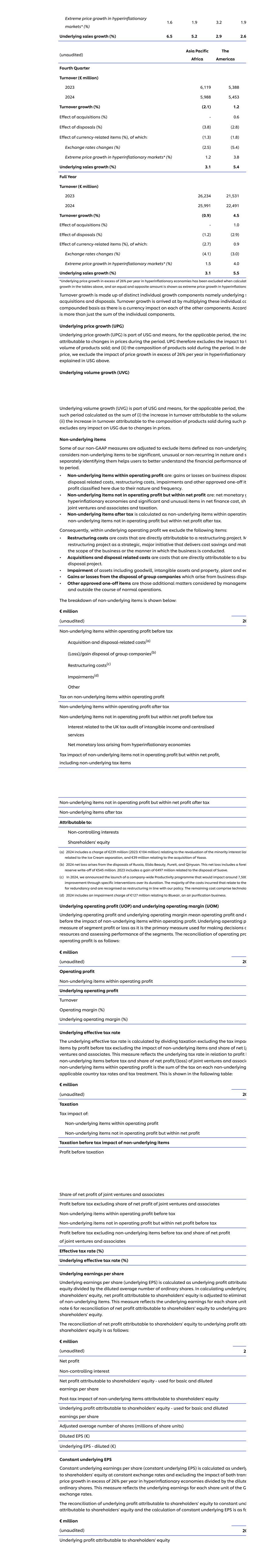 恶性通胀市场中的极端价格增长*(%)1.6 1.9 3.2 1.9基础销售增长(%)6.55.2 2.9 2.6(未经审计)亚太非洲美洲第四季度营业额(百万欧元)20236,1195,38820245,9885,453营业额增长(%)(2.1)1.2收购影响(%)-0.6处置影响(%)(3.8)(2.8)货币相关项目影响(%),其中:(1.3)(1.8)汇率变动(%)(2.5)(5.4)恶性通胀市场中的极端价格增长*(%)1.2 3.8基础销售增长(%)3.15.4全年营业额(百万欧元)202326,23421,531202425,99122,491营业额增长(%)(0.9)4.5收购影响(%)-1.0处置影响(%)(1.2)(2.9)货币相关项目影响(%),其中:(2.7)0.9汇率变动(%)(4.1)(3.0)恶性通胀市场中的极端价格增长*(%)1.5 4.0基础销售增长(%)3.15.5*在上表中计算增长时,恶性通货膨胀经济体中每年超过26%的基础价格增长已被排除在外,相等且相反的金额显示为恶性通货膨胀中的极端价格增长a营业额增长由不同的单独增长成分组成,即基础的收购和出售。营业额增长是通过乘以这些单独的共同复利基础得出的,因为对其他每个组成部分都有货币影响。雅阁不仅仅是各个组成部分的总和。基础价格增长(UPG)基础价格增长(UPG)是USG的一部分,是指在适用期间,归因于期间价格变化的公司。因此,UPG排除了对所售产品的U量的影响;以及(ii)该期间所售产品的构成。在Det价格中,我们排除了上文USG中解释的恶性通货膨胀中超过26%的价格增长的影响。基础销量增长(UVG)基础销量增长(UVG)是USG的一部分,是指,在适用期间,计算为(i)销量带来的营业额增长(ii)在该PE期间销售的产品构成带来的营业额增长之和的i此类期间不包括因价格变化对USG的任何影响。非基础项目我们的一些非GAAP衡量标准进行了调整,以排除被定义为非基础的项目,这些项目认为非基础项目具有重大、不寻常或非经常性,单独识别它们有助于用户更好地了解to period的财务业绩。•营业利润中的非基础项目为:业务处置损益a处置相关成本、重组成本、减值和其他经批准的一次性IT利润因其性质和频率在此分类。•不在营业利润中但在净利润中的非基础项目是:净货币g恶性通货膨胀经济和净财务成本中的重大和不寻常项目、SH合营企业和联营企业以及税收。•税后非基础项目不计入营业利润而是计入税后净利润的经营性非基础项目内的非基础项目。因此,在基本营业利润中,我们排除了以下项目:•重组成本是直接归属于重组项目的成本。M重组项目是一项战略性、重大举措,可实现成本节约并配合业务范围或业务开展方式。•收购和处置相关成本是直接归属于BU处置项目的成本。•包括商誉、无形资产和物业、厂房及EQ在内的资产减值•因业务纠纷产生的集团公司处置收益或损失•其他经批准的一次性项目是指管理层考虑并在正常经营过程之外的额外事项。非基础项目细分如下:百万欧元(未经审计)20税前营业利润内的非基础项目收购和处置相关成本(a)集团公司的(亏损)/收益处置(b)重组成本(c)减值(d)营业利润内的非基础项目的其他税项税后营业利润内的非基础项目不在营业利润内但在税前净利润内的非基础项目与英国对无形收入和集中服务的税务审计相关的利息恶性通货膨胀经济产生的净货币损失非基础项目的税收影响不在营业利润内但在净利润内,包括非基础税项非基础项目不计入营业利润但计入税后净利润的税后非基础项目归属于:非控股权益股东权益(a)2024年包括2.39亿欧元(2023年:1.04亿欧元)与冰淇淋分离相关的少数股东权益liab重估相关的费用, 以及与收购Yasso有关的3900万欧元。(b)2024净亏损产生于出售俄罗斯、亿利达美容、PureIT、沁园。这一净亏损包括5.45亿欧元的外汇储备冲销。2023年包括与出售Suave相关的4.97亿欧元收益。(c)2024年,我们宣布启动全公司生产力计划,该计划将在其持续时间内通过特定干预措施影响约7,500项改进。产生的大部分成本与冗余相关,并根据我们的政策被确认为重组。剩余成本包括technolo(d)2024包括与空气净化业务Blueair相关的1.27亿欧元减值费用。基础营业利润(UOP)和基础营业利润率(UOM)基础营业利润和基础营业利润率是指营业利润中非基础项目影响前的营业利润和o。分部损益的基本经营p衡量标准,因为它是用于决策资源和评估分部业绩的主要衡量标准。运营pro运营利润的调节如下:百万欧元(未经审计)20运营利润营业利润中的非基础项目基础运营利润周转率运营利润率(%)基础运营利润率(%)基础有效税率基础有效税率的计算方法是将不包括税收impac项目的税收除以不包括非基础项目的影响的税前利润和净份额(p风险和联营公司。该计量反映了与利润b税前非基础项目相关的基础税率以及在营业利润中应占合资企业和联营公司的净利润/(亏损)a非基础项目是每个非基础适用国家税率的税收和税收处理的总和。如下表所示:百万欧元(未经审计)20税项税项影响:营业利润内的非基础项目不计入营业利润但计入净利润的非基础项目税前影响税前利润占合营企业和联营企业净利润的份额税前利润不计入合营企业和联营企业净利润的份额税前利润不计入营业利润但计入税前净利润的非基础项目税前利润不计入非基础项目和占合营企业净利润的份额和联营公司有效税率(%)基础有效税率(%)基础每股收益基础每股收益(基础EPS)的计算方法为基础利润归属权益除以稀释后的普通股平均数。在计算基础股东权益时,调整归属于股东权益的净利润以剔除非基础项。这一计量反映了将归属于股东