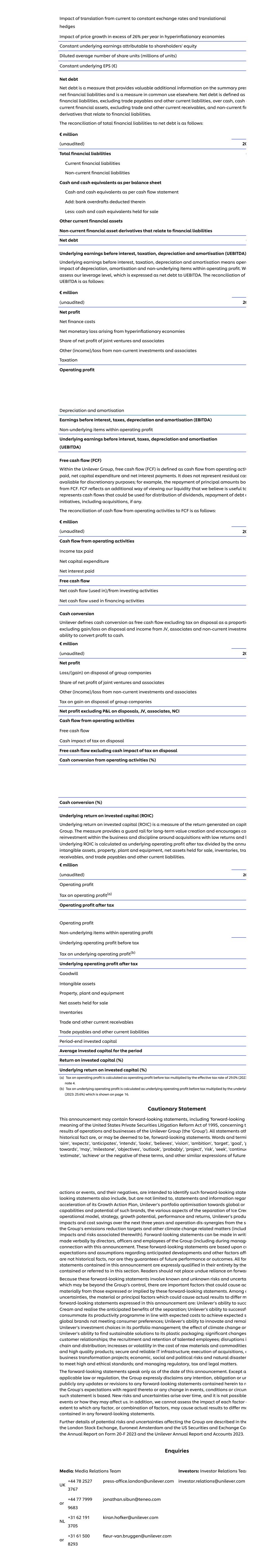 从当前汇率转换为固定汇率和换算对冲的影响恶性通货膨胀经济体每年价格增长超过26%的影响归属于股东权益的恒定基础收益稀释后的平均股份单位数(百万单位)恒定基础每股收益(欧元)净债务净债务是一种提供有关摘要pres净金融负债的有价值的额外信息的衡量标准,是其他地方常用的衡量标准。净负债定义为t金融负债,不包括贸易应付款项和其他流动负债,超过现金、现金e流动金融资产,不包括贸易和其他流动应收款项,以及与金融负债相关的非流动金融衍生品。金融负债总额与净债务的对账情况如下:百万欧元(未经审计)20金融负债总额(流动金融负债非流动金融负债资产负债表的现金及现金等价物现金流量表的现金及现金等价物加:其中扣除的银行透支减:持作出售的现金及现金等价物其他流动金融资产与金融负债相关的非流动金融资产衍生工具净债务(基础利息、税项、折旧及摊销前利润(UEBITDA)基础利息、税项、折旧及摊销前利润是指折旧的Opera影响,营业利润中的摊销和非基础项。我们评估我们的杠杆水平,表示为对UEBITDA的净债务。UEBITDA的对账如下:百万欧元(未经审计)20净利润净财务成本恶性通货膨胀经济产生的净货币亏损应占合营企业和联营企业的净利润其他(收入)/非流动投资和联营企业的亏损税收营业利润折旧和摊销前利润(EBITDA)营业利润中的非基础项目利息、税项、折旧和摊销前利润(UEBITDA)在联合利华集团内部的自由现金流(FCF)中,自由现金流(FCF)定义为支付的经营活动产生的现金流、净资本支出和净利息支付。它并不代表可供酌情使用的剩余CAS;例如,从FCF偿还本金金额bor。FCF反映了查看我们流动性的另一种方式,我们认为该方式有用,可以表示可用于分配股息、偿还债务o举措(包括收购)的现金流,如果有的话。经营活动现金流与FCF的对账如下:百万欧元(未经审计)20经营活动现金流支付所得税净资本支出净利息支付自由现金流净现金流(用于)/来自投资活动的净现金流使用于筹资活动的净现金流现金转换丨联合利华将现金转换定义为不含处置税的自由现金流按比例不含处置税以及来自合资企业、联营企业和非流动投资的收益将利润转化为现金的能力。百万欧元(未经审计)20处置集团公司净利润亏损/(收益)应占合营企业和联营企业净利润非流动投资和联营企业其他(收益)/亏损处置集团公司收益税不包括处置、合营企业、联营企业损益的净利润,NCI经营活动现金流自由现金流处置税的现金影响不含处置税的现金影响经营活动现金转换(%)现金转换(%)基础投资资本回报率(ROIC)基础投资资本回报率(ROIC)是衡量CAPIT Group产生的回报的指标。该措施为长期价值创造提供了一道护栏,并鼓励围绕低回报的收购在业务和纪律内进行共同再投资,l基础ROIC的计算方法是税后基础营业利润除以年度无形资产、物业、厂房和设备、持有待售净资产、存货、应收账款、贸易应付款和其他流动负债。百万欧元(未经审计)20营业利润营业利润税(a)税后营业利润营业利润营业利润内的非基础项目基本营业利润税前利润基本营业利润(b)税后基本营业利润商誉无形资产财产, 厂房及设备持作出售的净资产存货贸易及其他流动应收款贸易应付款项及其他流动负债期末投入资本平均投入资本期间投入资本回报率(%)基本投入资本回报率(%)(a)营业利润税按税前营业利润乘以29.0%的实际税率计算(2023年附注4。(b)基本经营溢利税的计算方法为税前基本经营溢利乘以第16页所示的基础(2023年:25.6%)。警示性声明本公告可能包含前瞻性声明,包括1995年美国私人证券诉讼改革法案的前瞻性含义,该法案涉及联合利华集团(‘集团’)的运营和业务结果。所有非历史事实的陈述都是,或可能被视为前瞻性陈述。词语和termi‘aim’,‘expectations’,‘anticipates’,‘intends’,‘looks’,‘believes’,‘vision’,‘ambition’,‘target’,‘goal’,‘p towards’,‘may’,‘milestone’,‘goals’,‘outlook’,‘probably’,‘project’,‘risk’,‘seeking’,‘continue’estimate‘,’achieve ' or the negative of these terms,and other similar expression of future action or event,and their negative,are intended to identify such forward-looking state l业绩和回报、联合利华未来三年的产品影响和成本节约以及与SE集团减排目标和其他气候变化相关事项(包括与之相关的影响和风险)的运营不协同效应。前瞻性陈述可由集团的董事、高级管理人员和雇员以口头形式作出(包括在与本公告进行管理联系期间)。这些前瞻性陈述基于对预期发展的预期和假设,其他因素不是历史事实,也不是对未来业绩或结果的保证。All for statements contained in this announcement are expressly qualified in their entire by the contained or referred to in this section。读者不应过分依赖forwar由于这些前瞻性陈述涉及已知和未知的风险以及可能超出集团控制范围的不确定因素,因此这些前瞻性陈述明示或暗示的内容中存在可能导致AC实质性的重要因素。在o不确定因素中,可能导致实际结果与本公告中所述前瞻性陈述不同的重大或主要因素有:联合利华 succCream并实现分离后预期收益的能力;联合利华 successfu按照预期成本完善其生产力计划以实现未满足消费者偏好的预期全球品牌的能力;联合利华的创新能力并重新审视联合利华在其投资组合管理中的投资选择;气候变化对联合利华为其塑料包装寻找可持续解决方