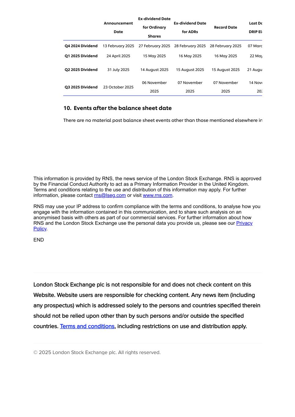 公告日期普通股除息日ADR记录日期最后日期DRIP ELE2024年第4季度股息2025年2月13日2025年2月27日2025年2月28日2025年2月28日2025年2月28日07马克2025年第1季度股息2025年4月24日2025年5月15日2025年5月16日2025年5月16日2025年5月22日2025年第2季度股息2025年7月31日2025年8月14日2025年8月15日2025年8月15日21日Augu Q3 2025股息2025年10月23日2025年11月7日2025年11月7日11月14日Nove 20210。资产负债表日之后的事件除本信息其他部分提及的事件外,没有其他重要的资产负债表后事件由伦敦证券交易所的新闻服务RNS提供。RNS经英国金融行为监管局批准,可作为英国的主要信息提供者。有关使用和分发这些信息的条款和条件可能适用。欲了解更多信息,请联系rns@lseg.com或访问www.rns.com。RNS可能会使用您的IP地址来确认遵守条款和条件,分析您如何使用本通信中包含的信息,并在匿名的基础上与其他人分享此类分析,作为我们商业服务的一部分。有关RNS和伦敦证券交易所如何使用您提供给我们的个人数据的更多信息,请参阅我们的隐私政策。END London Stock Exchange plc不负责也不检查本网站上的内容。网站用户有责任检查内容。任何新闻(包括任何招股章程)只针对其中指明的人和国家,除这些人和/或在指明国家之外,不应依赖这些人。条款和条件,包括使用和分配的限制适用。©2025年伦敦证券交易所股份有限公司。版权所有。