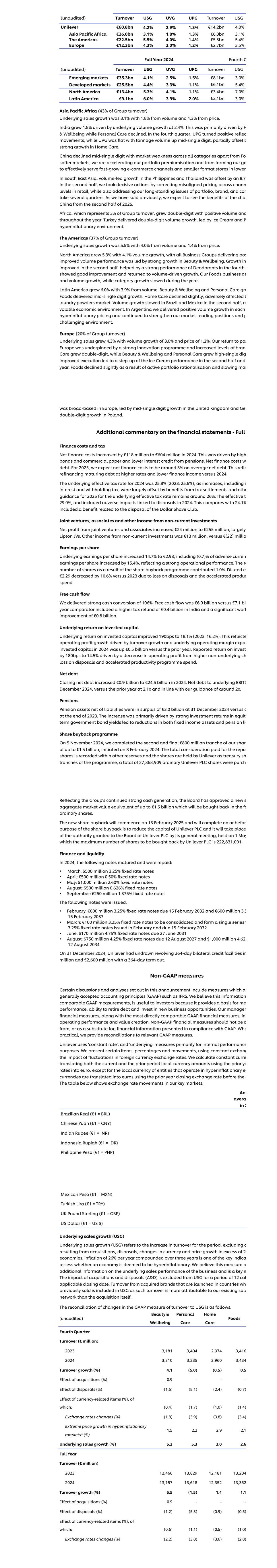 (未经审计)营业额USG UVG UPG营业额USG 联合利华 608亿欧元4.2% 2.9% 1.3% 142亿欧元4.0%亚太非洲260亿欧元3.1% 1.8% 1.3% 60亿欧元3.1%美洲225亿欧元5.5% 4.0% 1.4% 55.0亿欧元5.4%欧洲123亿欧元4.3% 3.0% 1.2% 27亿欧元3.5% 2024年第四季度(未经审计)营业额USG UVG UPG营业额USG新兴市场353亿欧元4.1% 2.5% 1.5% 81亿欧元3.0%发达市场255亿欧元4.4% 3.3% 1.1% 61亿欧元5.4%北美134亿欧元5.3% 4.1% 1.1% 34亿欧元7.0%拉丁美洲91亿欧元6.0% 3.9% 2.0% 21亿欧元3.0%亚太非洲(集团43%和价格的1.3%。印度增长1.8%,受基本销量增长2.4%的推动。这主要是由H & Wellbeing推动的,而个人护理有所下降。第四季度,UPG转为正反射运动,而UVG持平,吨位数量增长中个位数,部分抵消了b家庭护理的强劲增长。中国下降了中个位数,所有品类的市场疲软,除了FIO更疲软的市场,我们正在加速我们的产品组合高端化,并转变我们的Go,以有效服务于东南亚较低地区快速增长的电子商务渠道和较小的业态商店,菲律宾和泰国的销量带动的增长被下半年8.7%的增长所抵消,我们采取了果断行动,纠正了零售中跨chann水平的错位定价,同时也解决了我们长期存在的产品组合、品牌和com需要几个季度的问题。正如我们之前所说,我们预计将从2025年下半年开始看到chan中国的好处。占集团营业额3%的非洲在全年实现了两位数的正增长,销量为正。在冰淇淋和P恶性通胀环境的引领下,土耳其实现了两位数的销量增长。美洲(占集团营业额的37%)基础销售额增长5.5%,其中4.0%来自数量,1.4%来自价格。北美增长5.3%,销量增长4.1%,所有业务集团交付POS销量表现改善,主要得益于Beauty & Wellbeing的强劲增长。增长在下半年有所改善,受助于除臭剂在第四季度的强劲表现显示出良好的改善,并恢复到销量驱动的增长。我们的食品业务de和数量增长,而品类增长在年内放缓。拉丁美洲增长6.0%,其中销量增长3.9%。Beauty & Wellbeing和Personal Care Gre Foods实现中个位数增长。居家护理小幅下滑,不利影响b洗衣粉市场。下半年巴西和墨西哥的销量增长放缓,重新动荡的经济环境。在阿根廷,我们在每一次恶性通胀定价中都实现了正的销量增长,并继续加强我们的市场领先地位和充满挑战的环境。欧洲(占集团营业额20%)基础销售增长4.3%,数量增长3.0%,价格增长1.2%。我们重返POS欧洲的基础是强大的创新计划和更高水平的品牌护理增长了两位数,而Beauty & Wellbeing和Personal Care增长了高-单挖提高了执行力,导致冰淇淋业绩在下半年和今年有所提升。食品小幅下跌,原因是积极的投资组合合理化和放缓的mar在欧洲的基础广泛,英国的中个位数增长和波兰的GER两位数增长引领。财务报表附加评论-全Y财务成本和税收净财务成本在2024年增加了1.18亿欧元,达到6.04亿欧元。这是由高债券和商业票据以及来自养老金的利息信贷减少推动的。净财务成本我们的债务。对于2025年,我们预计净财务成本将在平均净债务的3%左右。与2024年相比,这反映了以更高的利率为到期债务再融资和更低的财务收入。2024年的基本有效税率为25.8%(2023年:25.6%),因为包括i利息和预扣税在内的增长在很大程度上被税收结算的好处所抵消,2025年基本有效税率的其他指导保持在26%左右。有效TA为29.0%,并包括与2024年处置相关的不利影响。相比之下,包括与处置美元剃须俱乐部相关的福利的比例为24.1%。来自非流动投资的合营企业、联营企业和其他收入来自合营企业和联营企业的净利润增加了2400万欧元,达到2.55亿欧元,主要是立顿合资企业。来自非流动投资的其他收益为1300万欧元,而每股收益为(22)百万欧元,每股基本收益增长14.7%至2.98欧元,其中包括(0.7)%的不利影响,每股收益增长15.4%, 反映了强劲的运营表现。股票回购计划导致的股票数量贡献了1.0%。由于处置损失和产品支出加速,稀释后的EA 2.29欧元与2023年相比下降了10.6%。自由现金流我们实现了106%的强劲现金转换。自由现金流为69亿欧元,而71亿欧元的比较数据包括印度4亿欧元的更高退税和8亿欧元的显着工作改善。基本投资资本回报率基本投资资本回报率改善190bps至18.1%(2023年:16.2%)。这反映了由营业额增长和基本营业利润率推动的营业利润增长2024年扩大投资资本比上一年增加了5亿欧元。报告的投资回报率为180bps至14.5%,这是由于处置的非基础ch损失增加和生产力计划支出加速导致营业利润下降。净债务2024年期末净债务增加9亿欧元至245亿欧元。净债务与基础EBITDA之比为2024年12月,上年为2.1倍,符合我们约2倍的指引。养老金截至2024年12月31日,扣除负债后的养老金资产盈余为30亿欧元,而2023年底为盈余。这一增长主要是由于股权定期国债收益率的强劲投资回报导致固定收益资产和养老金lia都减少股票回购计划2024年11月5日,我们完成了第二次也是最后一次8亿欧元的份额,最高为15亿欧元,于2024年2月8日启动。就回购股份支付的总代价记录在其他储备中,而股份由联合利华作为库藏SH档持有。根据该计划,总共购买了27,368,909股Unilever Plc普通股,反映出该集团持续强劲的现金生成能力。董事会已批准新的总市值等值高达15亿欧元,将以普通股回购。新股份回购将于2025年2月13日开始,并将于股份回购的目的是减少Unilever Plc的资本或在此之前完成,并将取代5月1日举行的股东大会授予Unilever Plc董事会的授权,其中Unilever Plc将回购的股份数量上限为222,831,091股。2024年金融和流动性,以下票据到期并已偿