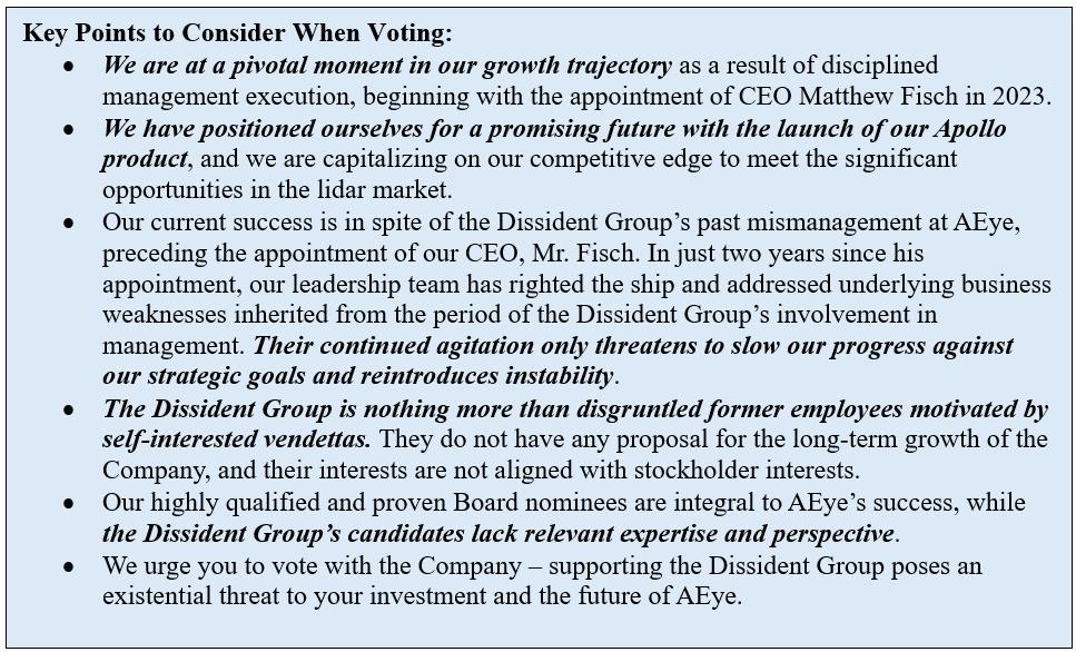 我们敦促您在我们的年会上投票保护您的投资。不要让持不同政见者集团的利己运动让AEye偏离正轨,并解除我们的董事会和管理层自2023年以来取得的重大进展。