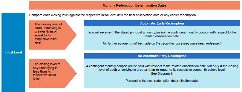 证券在原发行日后六个月前不得自动提前赎回。在这最初的6个月非赎回期之后,如果在2024年9月16日开始的任何赎回确定日期,每个标的的收盘水平高于或等于其各自的初始水平,则证券将在相关的提前赎回日期自动赎回以获得提前赎回付款。一旦赎回证券,将不会再支付任何款项。 如果任何标的的收盘水平低于相关赎回确定日该等标的的相应初始水平,则该证券将不会在任何提前赎回日期提前赎回。 |