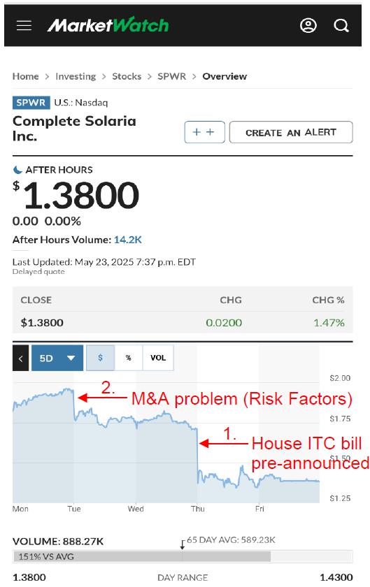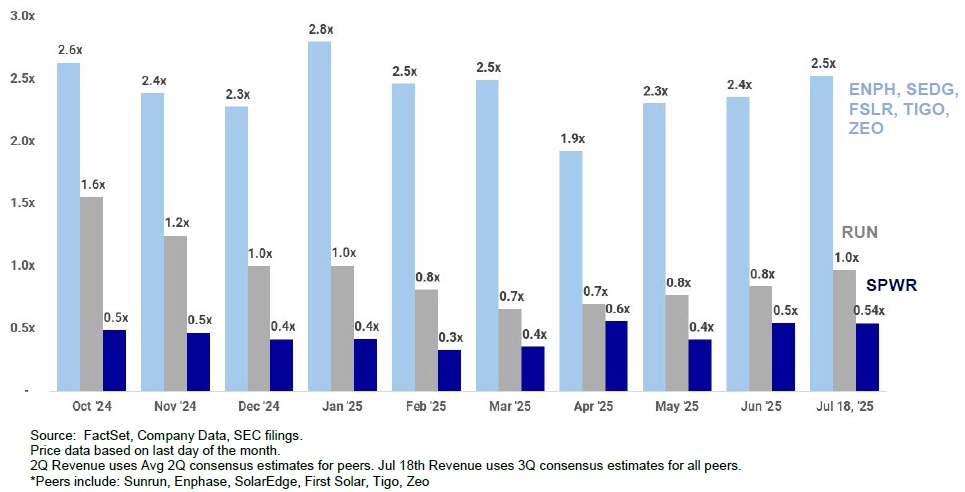 我们的一篮子比较科技股*拥有稳定的2.5x市盈率(我的老公司赛普拉斯半导体 30年市盈率中位数为2.4x),但太阳能行业最近承受着关税和ITC压力,这甚至导致太阳能龙头SunRun在0.7x触底反弹,目前回升至1.0x。那么,尽管财务表现良好,为何SPWR仍以0.54x的速度拖着走?
