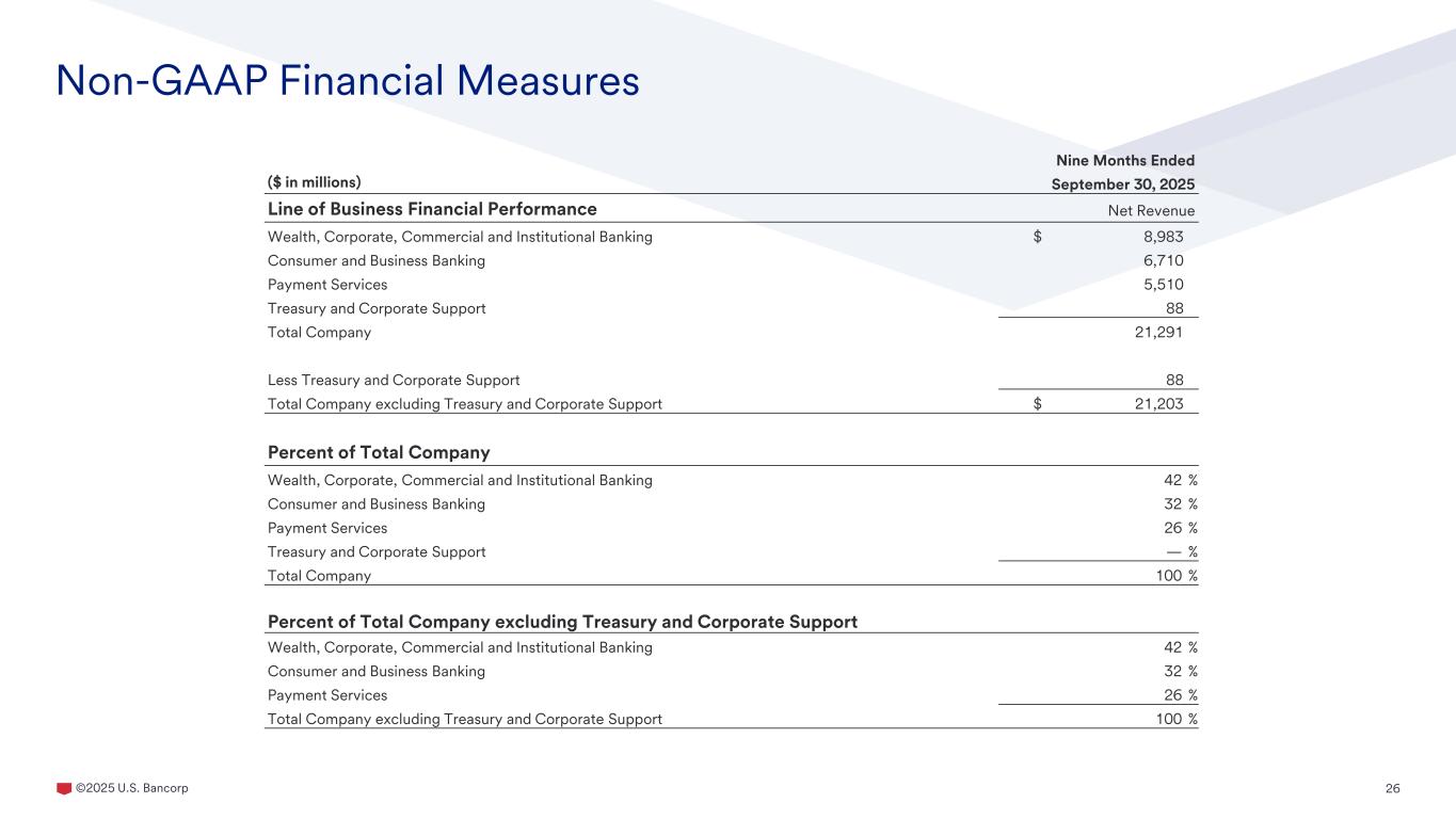 ©2025年美国合众银行 26项非公认会计准则财务指标(百万美元)截至2025年9月30日的九个月业务线财务业绩净收入财富、企业、商业和机构银行业务8,983美元消费者和商业银行业务6,710支付服务5,510资金和企业支持88公司总额21,291减去资金和企业支持88公司总额不包括资金和企业支持21,203美元占公司总财富的百分比,公司,商业和机构银行业务42%消费者和商业银行业务32%支付服务26%资金和企业支持—%公司总数100%不包括资金和企业支持的公司总数百分比财富、公司、商业和机构银行业务42%消费者和商业银行业务32%支付服务26%不包括资金和企业支持的公司总数100%