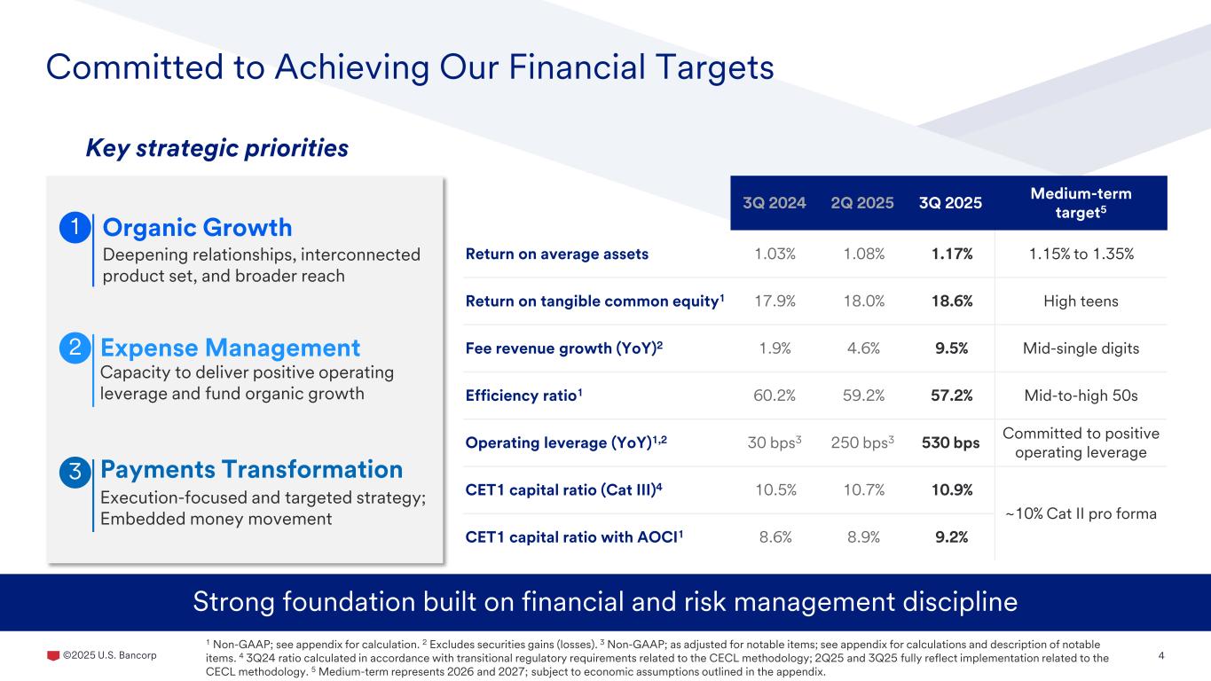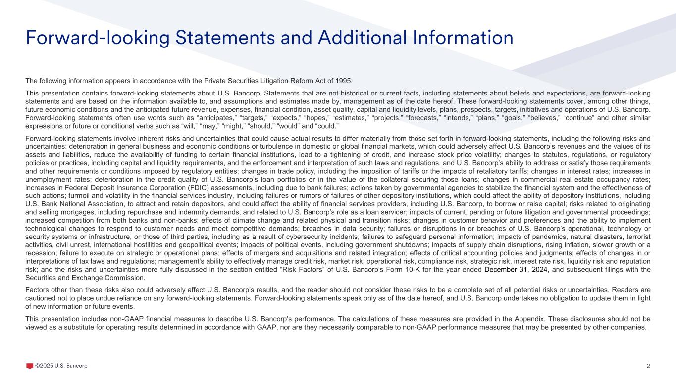©2025 美国合众银行 2项前瞻性陈述和附加信息以下信息是根据1995年《私人证券诉讼改革法案》出现的:本演示文稿包含有关美国合众银行的前瞻性陈述。非历史或当前事实的陈述,包括关于信念和预期的陈述,均为前瞻性陈述,并基于截至本文发布之日管理层可获得的信息以及做出的假设和估计。除其他事项外,这些前瞻性陈述涵盖未来经济状况以及美国合众银行预计的未来收入、费用、财务状况、资产质量、资本和流动性水平、计划、前景、目标、举措和运营。前瞻性陈述经常使用“预期”、“目标”、“预期”、“希望”、“估计”、“项目”、“预测”、“打算”、“计划”、“目标”、“相信”、“继续”等类似表述或未来或条件动词,如“将”、“可能”、“可能”、“应该”、“将”和“可以”。前瞻性陈述涉及固有风险和不确定性,可能导致实际结果与前瞻性陈述中所述的结果存在重大差异,包括以下风险和不确定性:一般商业和经济状况恶化或国内或全球金融市场动荡,这可能会对美国合众银行的收入及其资产和负债的价值产生不利影响,减少某些金融机构的资金供应,导致信贷收紧,并增加股价波动;法规、法规或监管政策或做法的变化,包括资本和流动性要求,以及此类法律法规的执行和解释,以及美国合众银行满足或满足这些要求的能力以及监管实体施加的其他要求或条件;贸易政策的变化,包括征收关税或报复性关税的影响;利率的变化;失业率的上升;美国合众银行贷款组合的信用质量或为这些贷款提供担保的抵押品的价值恶化;商业房地产占用率的变化;联邦存款保险公司(FDIC)评估的增加,包括由于银行倒闭;政府机构为稳定金融体系而采取的行动以及此类行动的有效性;金融服务业的动荡和波动,包括其他存款机构的倒闭或倒闭传闻,这可能会影响包括美国银行全国协会在内的存款机构吸引和留住储户的能力,并可能影响包括美国合众银行在内的金融服务提供商借入或筹集资本的能力;与发起和出售抵押贷款相关的风险,包括回购和赔偿要求,以及与美国合众银行作为贷款服务商的角色相关的风险;当前的影响,未决或未来的诉讼和政府程序;来自银行和非银行的竞争加剧;气候变化的影响以及相关的物理和过渡风险;客户行为和偏好的变化以及实施技术变革以响应客户需求和满足竞争需求的能力;数据安全漏洞;美国合众银行的运营、技术或安全系统或基础设施或第三方的系统或基础设施出现故障或中断或遭到破坏,包括由于网络安全事件;未能保护个人信息;流行病、自然灾害、恐怖活动、内乱、国际敌对行动和地缘政治事件;政治事件的影响,包括政府停摆;供应链中断、通胀上升、增长放缓或衰退的影响;未能执行战略或运营计划;并购和相关整合的影响;关键会计政策和判断的影响;税法法规变更或解释的影响;管理层有效管理信用风险、市场风险、操作风险、合规风险、战略风险、利率风险的能力,流动性风险和声誉风险;以及美国合众银行截至2024年12月31日止年度的10-K表格以及随后向美国证券交易委员会提交的文件中题为“风险因素”的部分中更全面讨论的风险和不确定性。这些风险以外的其他因素也可能对美国合众银行的业绩产生不利影响,读者不应认为这些风险是所有潜在风险或不确定性的完整集合。告诫读者不要过分依赖任何前瞻性陈述。前瞻性陈述仅在本文发布之日起生效, 并且美国合众银行不承担根据新信息或未来事件对其进行更新的义务。该演示文稿包括用非公认会计准则财务指标来描述美国合众银行的业绩。这些措施的计算在附录中提供。这些披露不应被视为替代根据GAAP确定的经营业绩,也不一定与其他公司可能提出的非GAAP业绩衡量标准具有可比性。