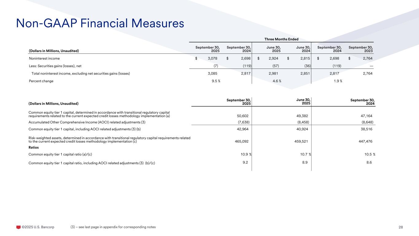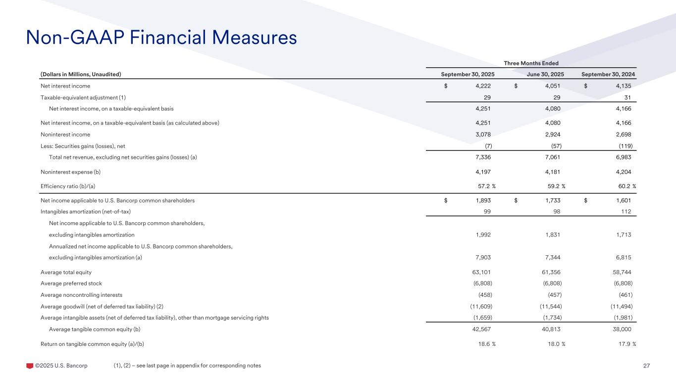 ©2025 美国合众银行 27项截至三个月的非公认会计准则财务指标(百万美元,未经审计)2025年9月30日2025年6月30日2024年9月30日净利息收入4,222美元4,051美元4,135美元应税等值调整(1)292931净利息收入,在应税等值基础上4,2514,0804,166净利息收入,在应税等值基础上(如上计算)4,2514,0804,166非利息收入3,0782,9242,698减:证券收益(损失),净额(7)(57)(119)总净营收,不包括证券净损益(a)7,3367,0616,983非利息费用(b)4,1974,1814,204效率比(b)/(a)57.2% 59.2% 60.2%适用于美国合众银行普通股股东的净收入1,893美元1,733美元1,601美元无形资产摊销(税后净额)9998112适用于美国合众银行普通股股东的净收入,不包括无形资产摊销1,9921,8311,713适用于美国合众银行普通股股东的年化净收入,不包括无形资产摊销(a)7,9037,3446,815平均总股本63,10161,35658,744平均优先股(6,808)(6,808)(6,808)平均非控制性权益(458)(457)(461)平均商誉(扣除递延所得税负债)(2)(11,609)(11,544)(11,494)平均无形资产(扣除递延所得税负债),除抵押服务权(1,659)(1,734)(1,981)平均有形普通股本(b)42,56740,81338,000有形普通股本回报率(a)/(b)18.6% 18.0% 17.9%(1),(2)–相应附注见附录最后一页