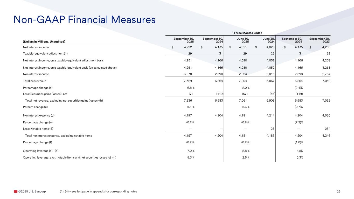 ©2025 美国合众银行 29项非公认会计准则财务指标截至三个月(百万美元,未经审计)2025年9月30日2024年9月30日2025年6月30日2024年6月30日2024年9月30日2023年9月30日净利息收入4,222美元4,135美元4,051美元4,023美元4,135美元4,236美元应税等值调整(1)293129293132净利息收入,在应税等值调整基础上4,2514,1664,0804,0524,1664,268净利息收入,按应税等值基准(如上计算)4,2514,1664,0804,0524,1664,268非利息收入3,0782,6982,9242,8152,6982,764净收入总额7,3296,8647,0046,8676,8647,032百分比变化(a)6.8% 2.0%(2.4)%减:证券收益(损失)净额(7)(119)(57)(36)(119)净收入总额,不包括证券收益(损失净额)(b)7,3366,9837,0616,9036,9837,032百分比变化(c)5.1% 2.3%(0.7)%非利息费用(d)4,1974,2044,1814,2144,2044,530百分比变化(e)(0.2)%(0.8)%(不包括显著项目4,1974,2044,1814,1884,2044,246百分比变化(f)(0.2)%(0.2)%(1.0)%经营杠杆(a)-(e)7.0% 2.8% 4.8%经营杠杆,不包括显著项目和净证券损失(c)-(f)5.3% 2.5% 0.3%(1),(4)–相应附注见附录最后一页