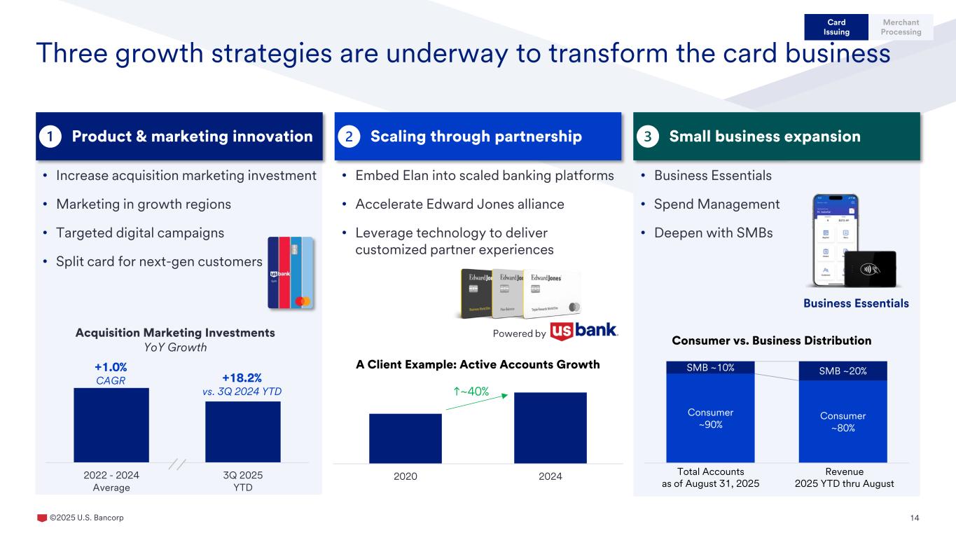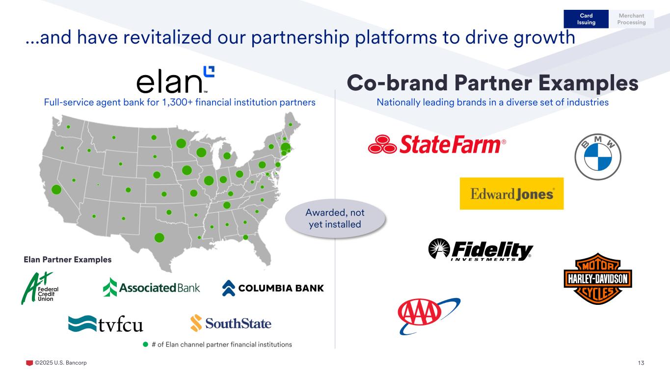 ©2025 美国合众银行 13…并已盘活我们的合作伙伴平台以驱动增长联合品牌合作伙伴示例在多元化行业中的全国领先品牌● # of Elan渠道合作伙伴金融机构为1,300 +家金融机构合作伙伴提供全方位服务的代理银行Elan合作伙伴示例已获奖,尚未安装发卡商户处理