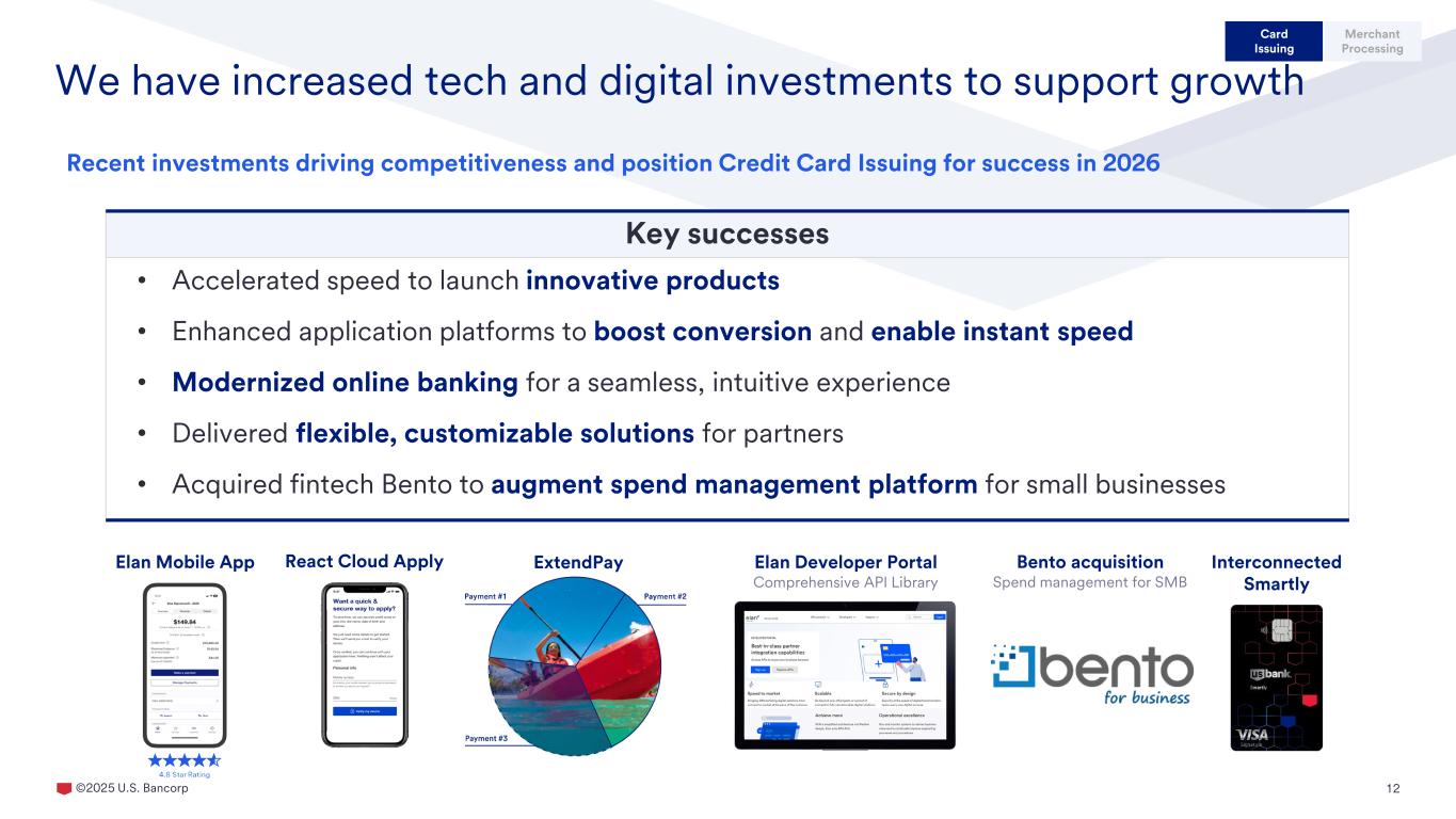 ©2025 美国合众银行 12我们增加了技术和数字投资以支持增长最近的投资推动了竞争力,并将信用卡发行定位于2026年的成功•加快速度推出创新产品•增强应用程序平台以促进转化并实现即时速度•现代化的网上银行,以提供无缝、直观的体验•为合作伙伴提供灵活、可定制的解决方案•收购了金融科技Bento,以增强小型企业的支出管理平台关键成功React Cloud ApplyElan移动应用ExtendPay Elan开发者门户综合API库互联智能Bento获取支出管理,用于丨发卡商户处理