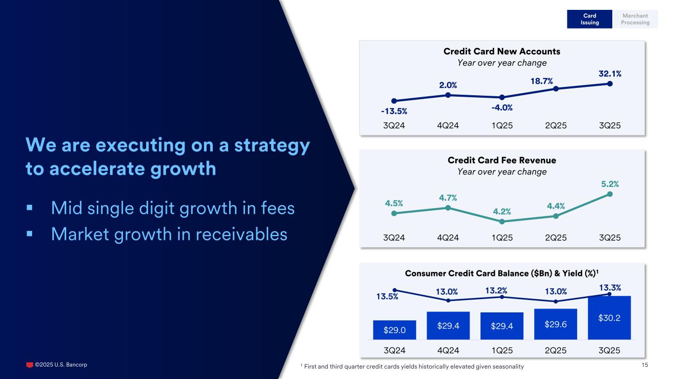 ©2025 美国合众银行 14三大增长战略正在进行中转型卡片业务•增加收购营销投资•增长区域营销•有针对性的数字活动•分割卡面向下一代客户•将Elan嵌入规模化银行平台•加速Edward Jones联盟•利用技术提供定制化的合作伙伴体验•业务要点•支出管理•通过合作伙伴关系深化与SMB的扩展产品和营销创新小型企业扩张消费者~90%消费者~80% SMB~10% SMB~20%总账户收入消费者vs.业务分布20202024个客户示例:活跃账户增长~40%发卡商户处理业务要点截至8月31日的总账户,2025年收入2025年年初至今截至2022年8月-2024年平均2025年第三季度年初至今收购营销投资同比增长+ 18.2%,而2024年第三季度年初至今复合年增长率+ 1.0%