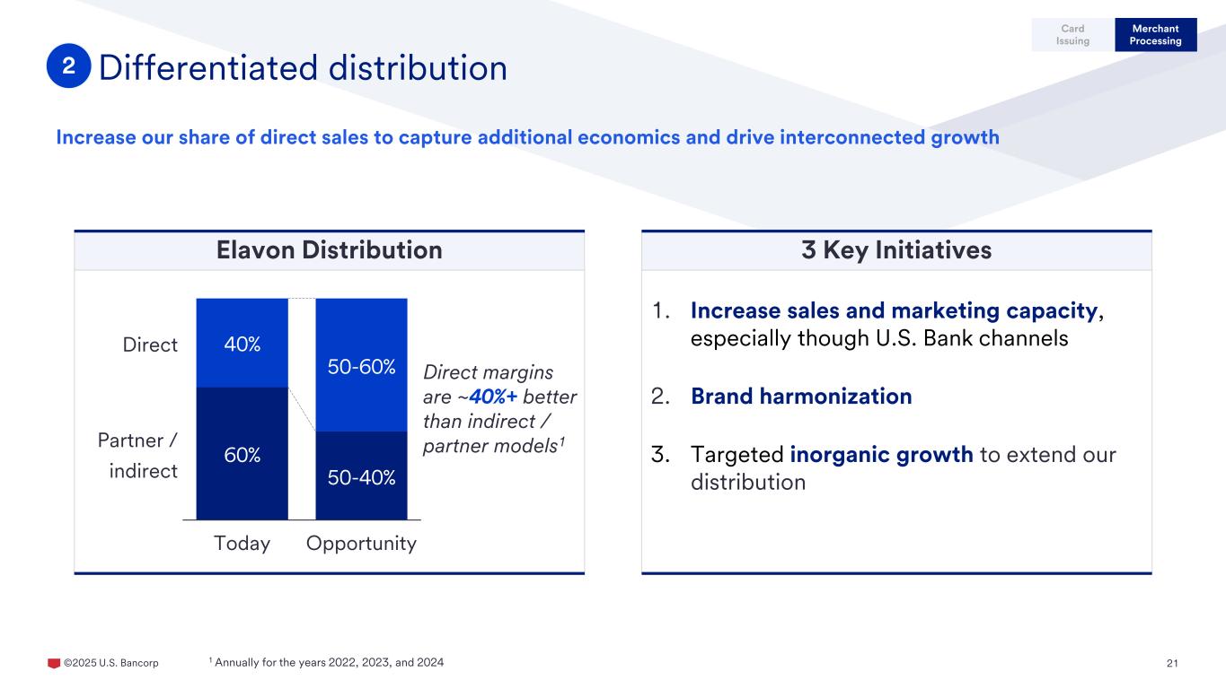 ©2025 美国合众银行 21差异化分销增加我们在直销中的份额,以获取额外的经济性并推动相互关联的增长21。提高销售和营销能力,尤其是通过美国银行渠道2。品牌协调3。有针对性的无机增长以扩展我们的分销3个关键举措Elavon分销60% 40%今天50-60 % 50-40 %机会直接合作伙伴/间接直接利润率比间接/合作伙伴模式好~40% + 1每年2022、2023和2024年发卡商家处理